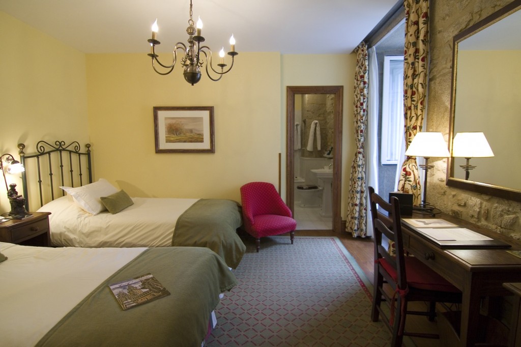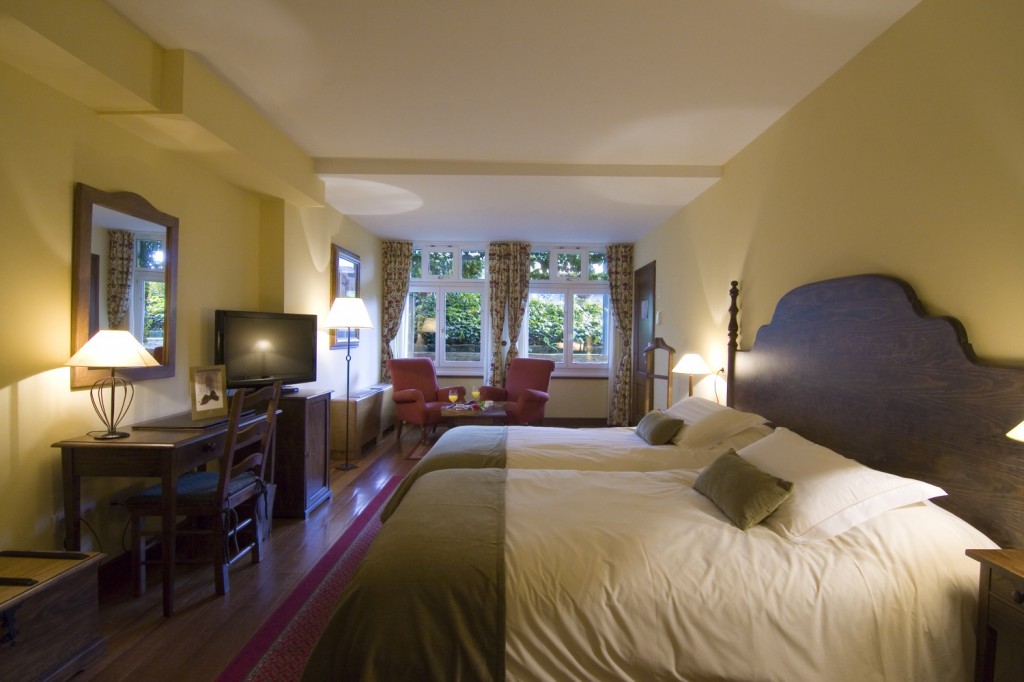 o Habitaciones standard: ubicada en el edificio de reciente construcción del hotel, a la que se accede a través de un paseo acristalado a modo de claustro que bordea su espléndido jardín privado, Decorada con mobiliario tipo anticuario y totalmente equipada, cuya sínteses sería: habitación cómoda y agradable.
