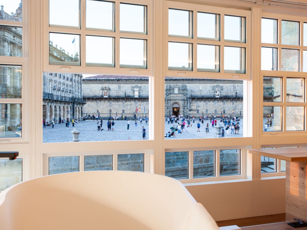 1 Deluxe Double with panoramic views of Obradoiro Square, king size bed, bathtub and coffee machine. This lasts ,both with lift access.