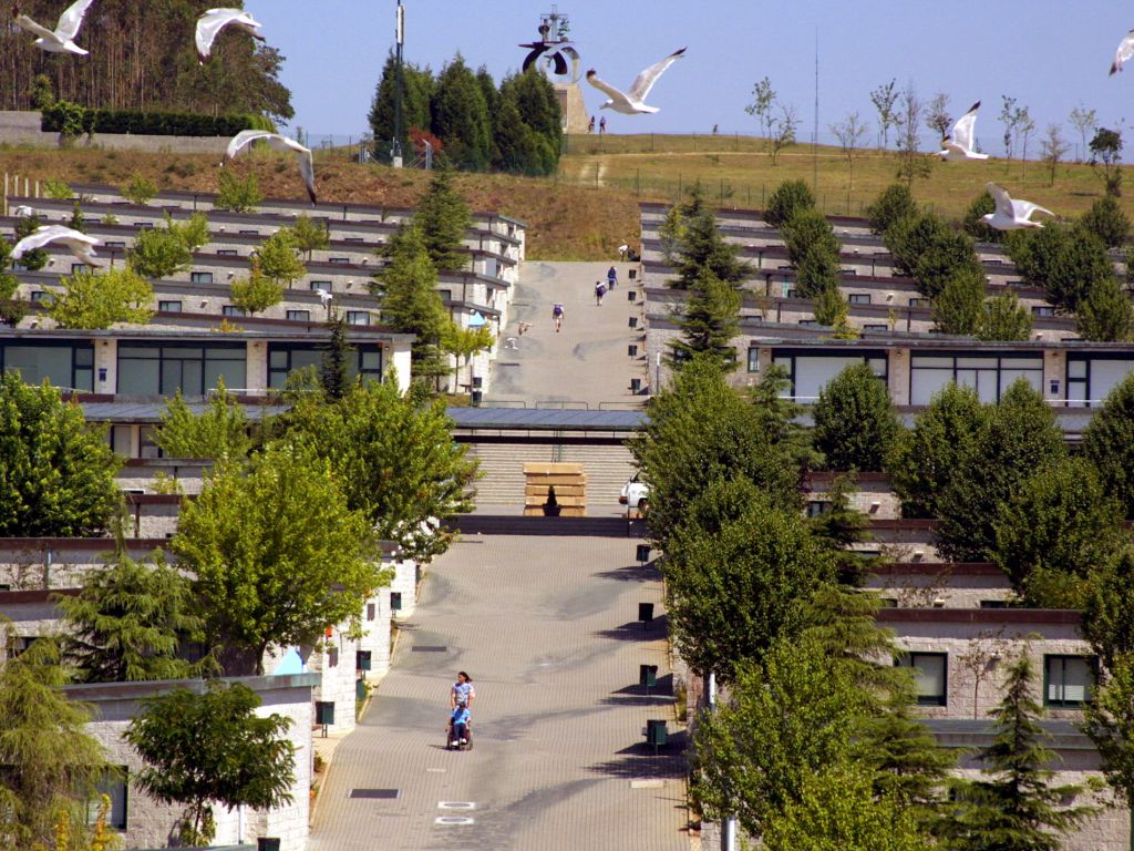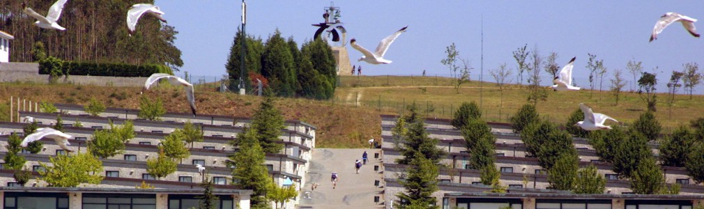 Monxoi, o Monte Gaudii, o Monte do Gozo, es la antesala a la ciudad de Santiago para los peregrinos. La cumbre de sus 368 metros de altura es el punto del Camino Francés desde el que se divisan, por primera vez, las torres de la Catedral. Con ocasión del Año Santo de 1993, la Xunta de Galicia abordó una serie de actuaciones en esta área para conformar todo un conjunto de equipamientos y servicios dirigidos a los peregrinos. Los 600.000 metros cuadrados se ordenaron contemplando cuatro zonas construidas, unidas por ajardinamiento y viales. Estas piezas son un Camping, encargado a Celestino García; la zona residencial, diseñada por José Antonio Franco; el Auditorio, de Alfonso Penela; y el Centro Europeo de Peregrinación y Pastoral Juvenil, del que es autor Iago Seara.