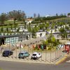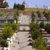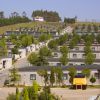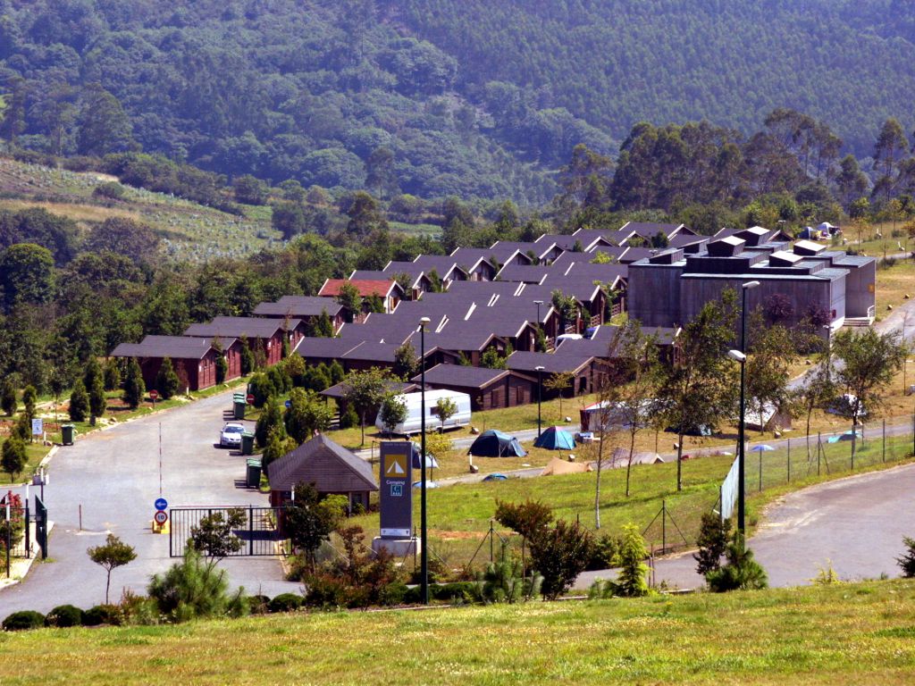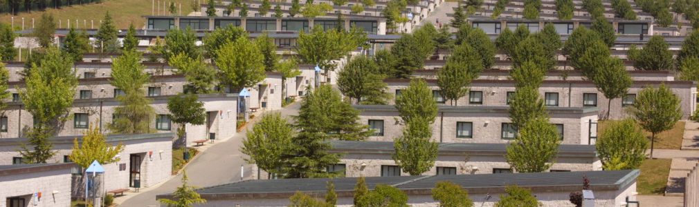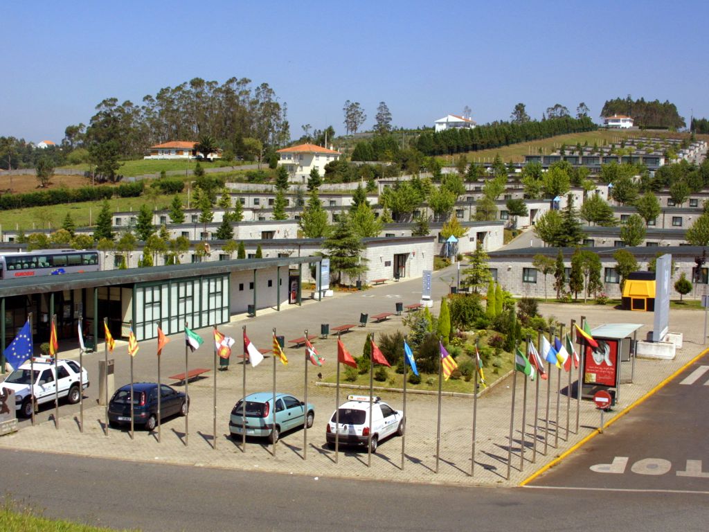 Todas las piezas construidas se pegan al terreno, intentando fundirse con el. Así las cubiertas de los numerosos pabellones del área de acogida, de los edificios del camping y de los volúmenes del Centro de Peregrinación son de cobre, que al oxidarse presenta un color verde pálido, mimetizando edificios y áreas ajardinadas.