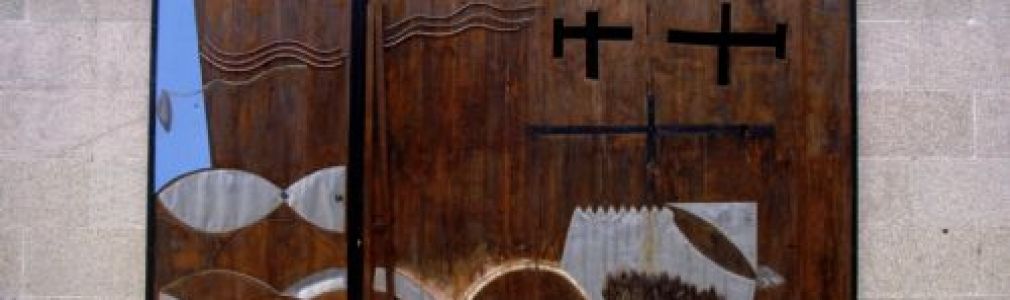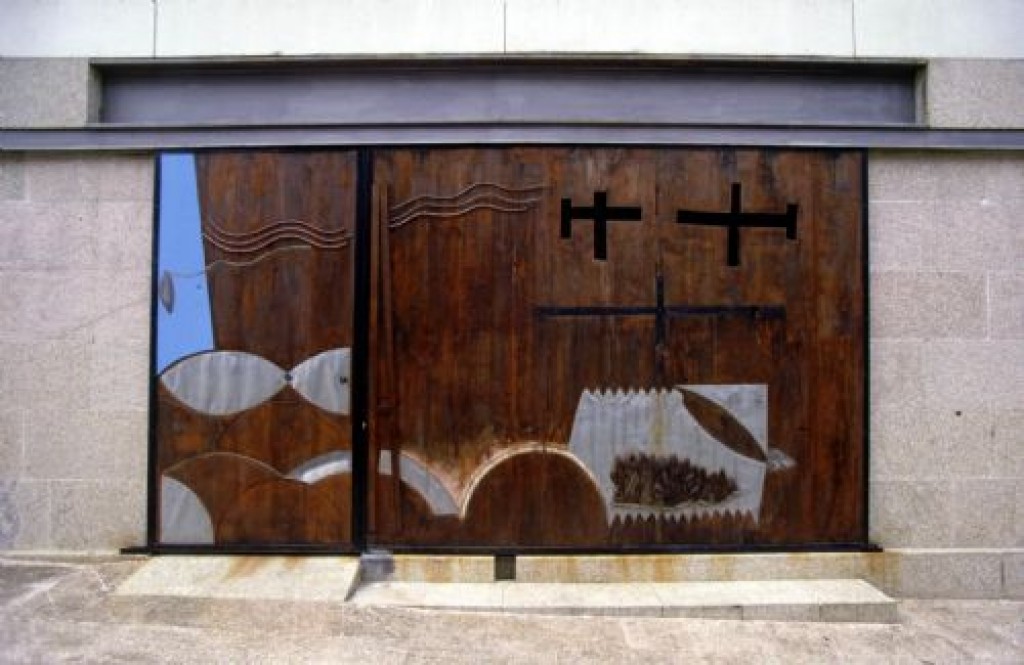 La puerta principal de la iglesia, de la que es autor el escultor Ignacio Basallo, se concibió como un elemento plástico de fuerte presencia. Su tratamiento híbrido como un pieza pictórica y escultórica protagoniza y caracteriza el espacio exterior del templo. Durante el tiempo en el que esta pieza se abre, queda incorporada a los límites del recinto como un relieve mural.