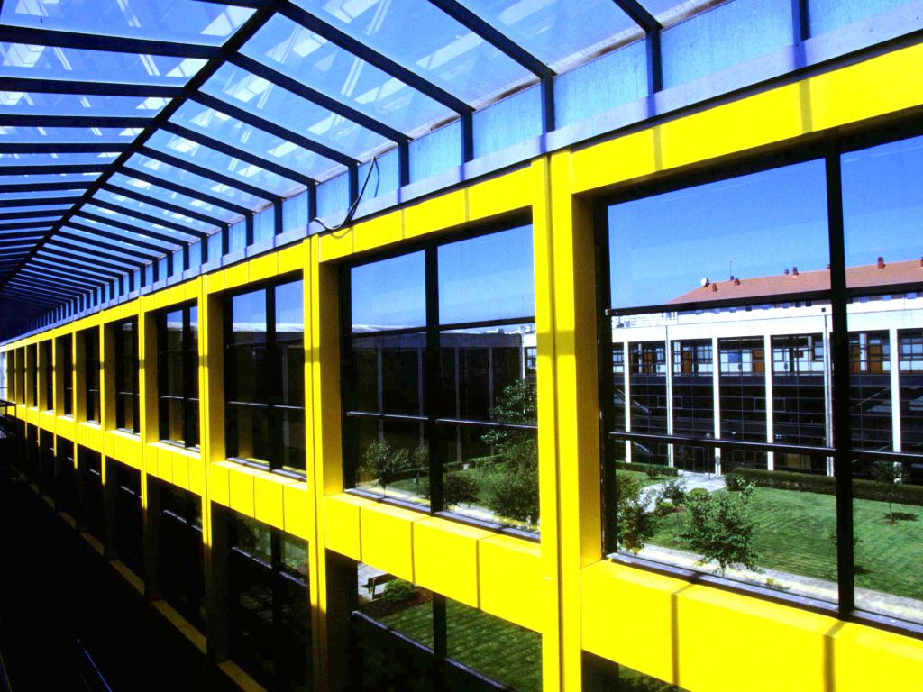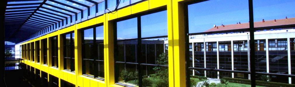 Desde el patio interior, se descubre la verdadera naturaleza del complejo: en realidad se trata de cuatro edificios concebidos, cada uno de ellos, como un prisma, que se van colocando hasta formar las cuatro fachadas del conjunto. Así, el cuerpo oeste está destinado a las tareas administrativas del centro, con un despiece complejo de despachos y espacios de trabajo. La zona sur alberga los espacios singulares, como la sala de exposiciones o la biblioteca y el salón de actos, estos dos últimos dispuestos a doble altura. En el cuerpo este se emplazan las aulas y seminarios, con un generoso espacio de relación paralelo a la piel de vidrio abierta al patio. Por último, el volumen norte está dedicado a la residencia de estudiantes, con los dormitorios, comedores y espacios de estar.