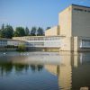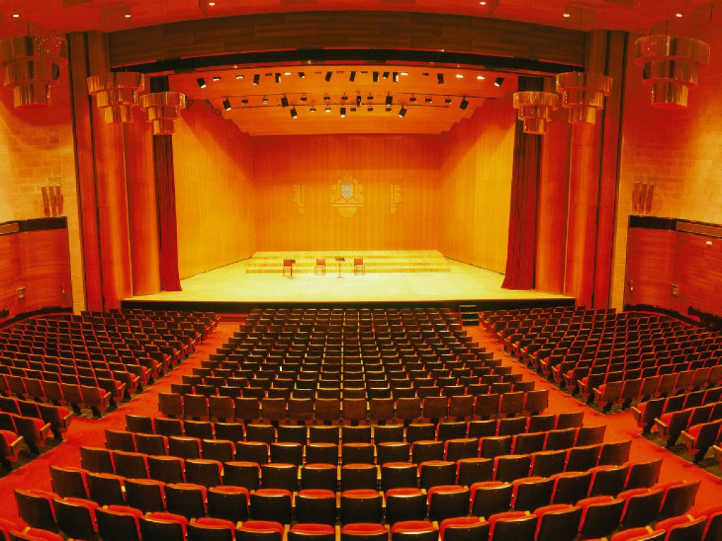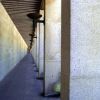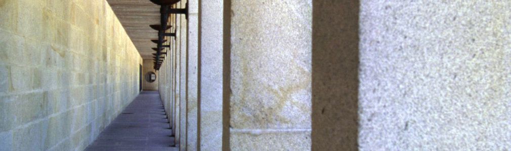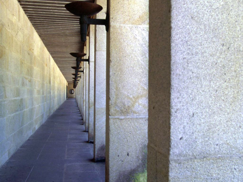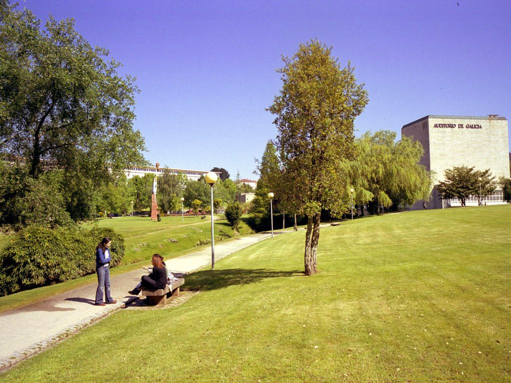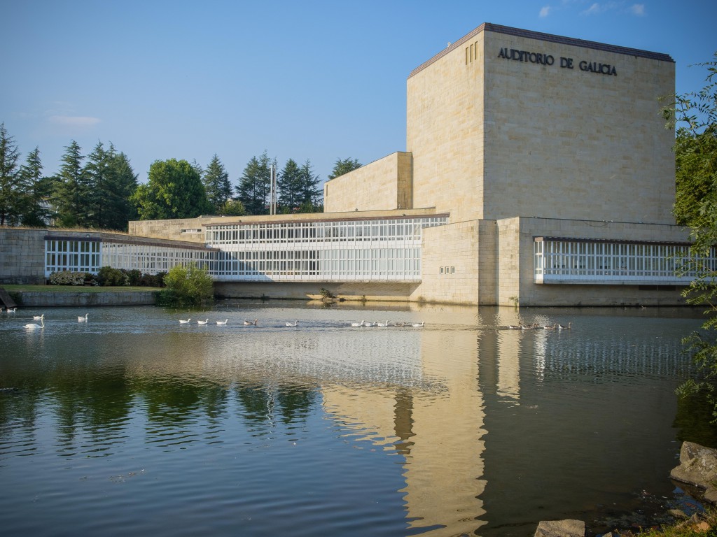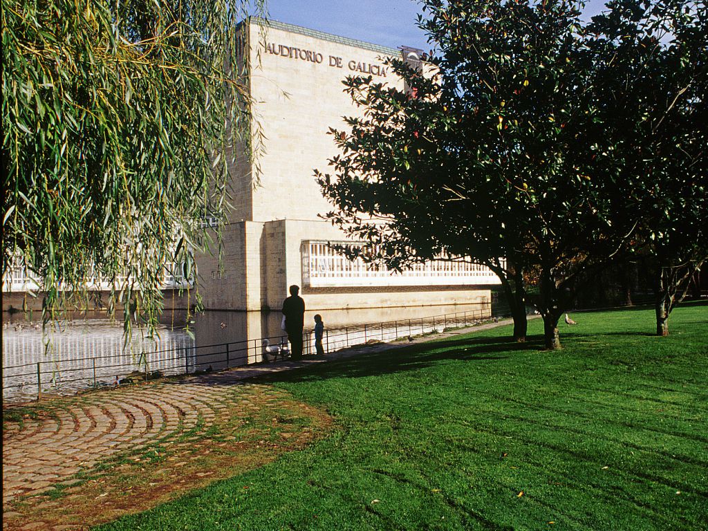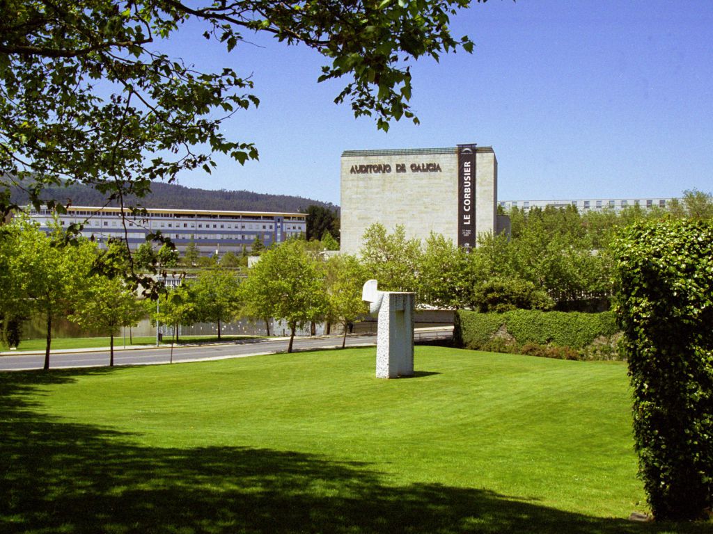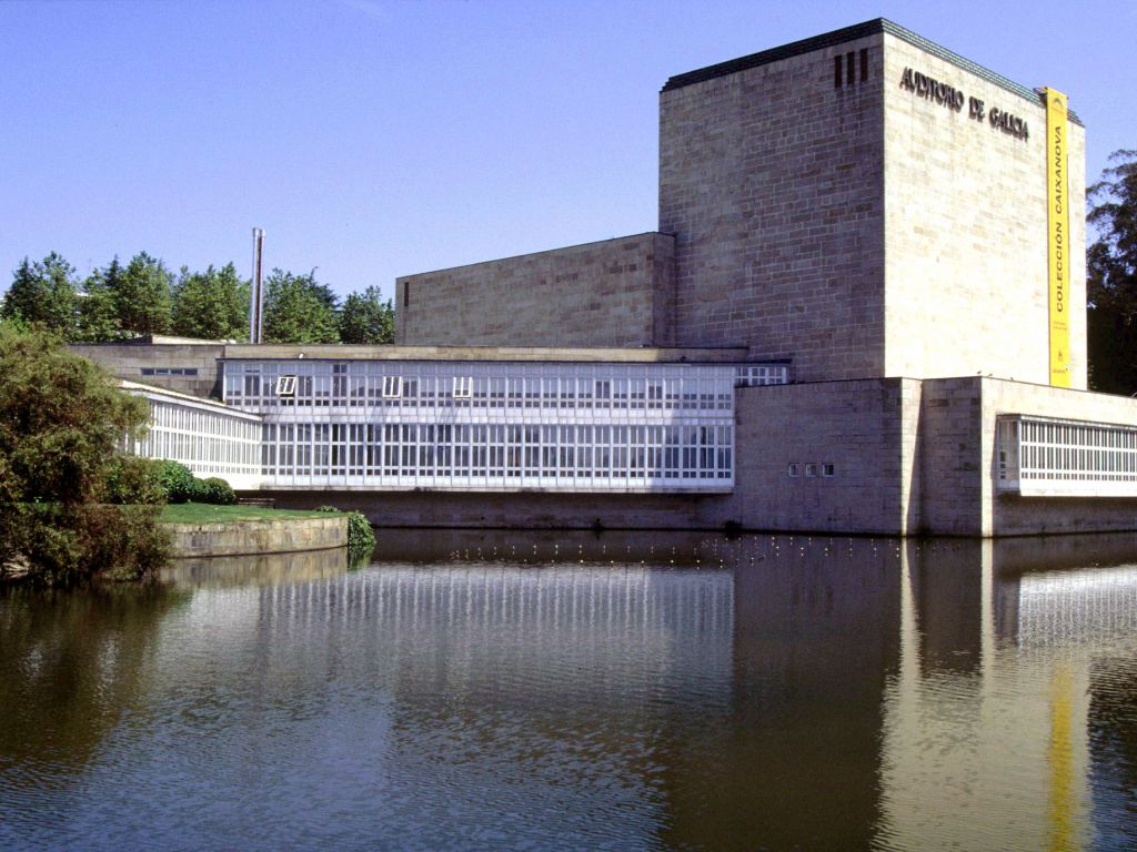 En 1964 el arquitecto Julio Cano Lasso realizó el conjunto de pabellones para albergue de peregrinos, con ocasión del Año Santo. La obra, concebida como temporal, pervivió años ofreciendo alojamiento a los estudiantes. Sobre la traza de aquella obra modesta y ejemplar, por su racionalidad e implantación, su mismo autor construyó el Auditorio de Galicia. Este gran complejo, destinado a dotar a Santiago de un edificio capaz de desarrollar una programación musical y expositiva de alto nivel, se proyectó con una serie de severos volúmenes de piedra, con el contrapunto de paños de vidrio horizontales, con particiones blancas y menudas, que evocan la tradición de las galerías.