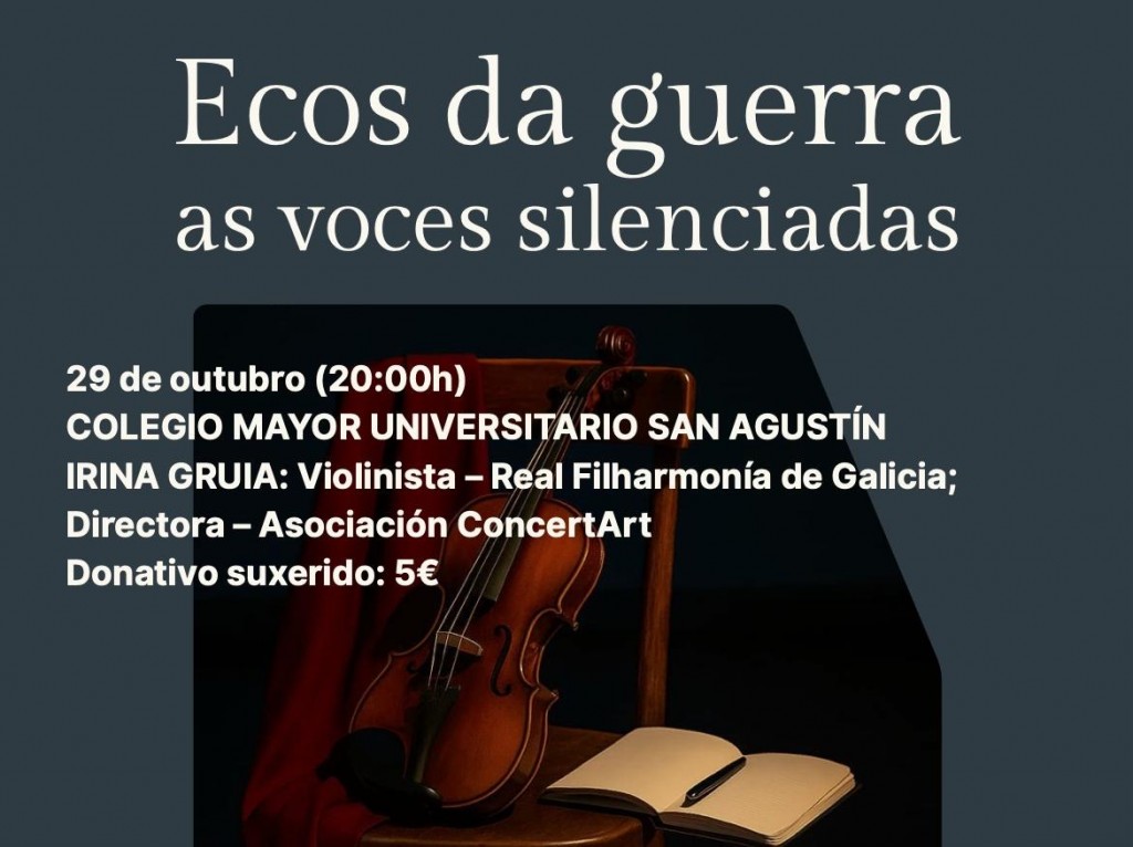 El miércoles 29 de octubre, a las 20:00 h, en el Salón de Actos del Colegio Mayor Universitario San Agustín, se presenta un espectáculo profundamente emotivo y educativo, con Irina Gruia, violinista de la Real Filharmonía de Galicia y directora de la Asociación ConcertArt. A través de la música, la narración y la participación activa, el espectáculo aborda los horrores de la guerra desde la perspectiva de cuatro niñas, cada una atrapada en su tiempo y lugar, pero todas unidas por la experiencia común del sufrimiento. Donativo sugerido: 5€.