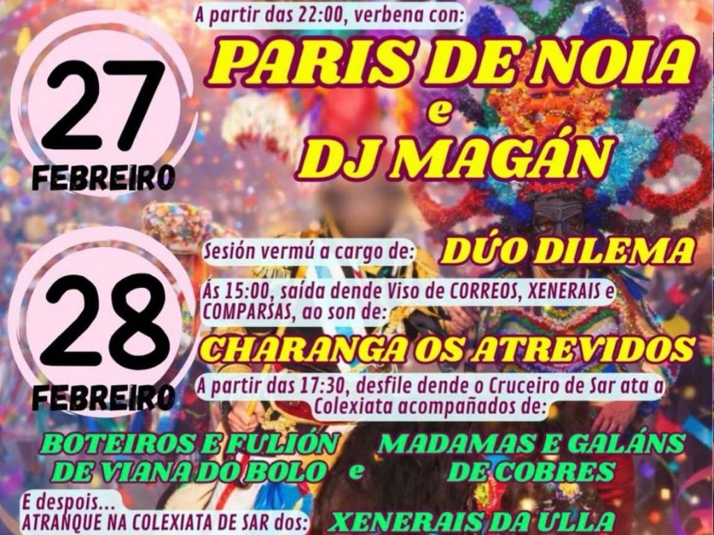 Reservad los días 27 y 28 de febrero para el gran Entroido de Sar, con música, colores y fiesta en el barrio. El sábado 27, actuación de París de Noia, y el domingo 28, desfile de los Xenerais da Ulla. ¡No faltéis!
