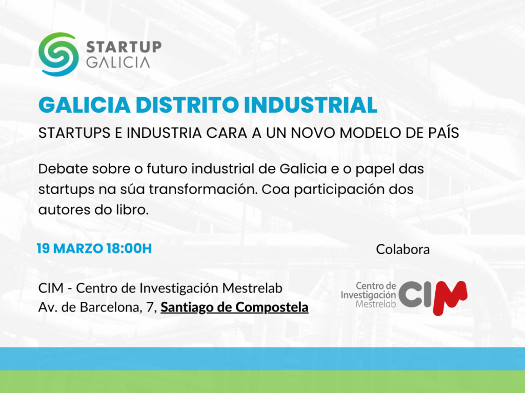 Mesa redonda alrededor del libro Galicia Distrito Industrial que organiza la asociación StartupGalicia en la que se acercarán al tejido de empresas gallegas innovadoras, internacionalizadas y con alto valor añadido y conversarán sobre como las startups pueden impulsar la innovación y transformar el país, aprovechando el conocimiento y los recursos de un territorio con fuerte tradición productiva e industrial.