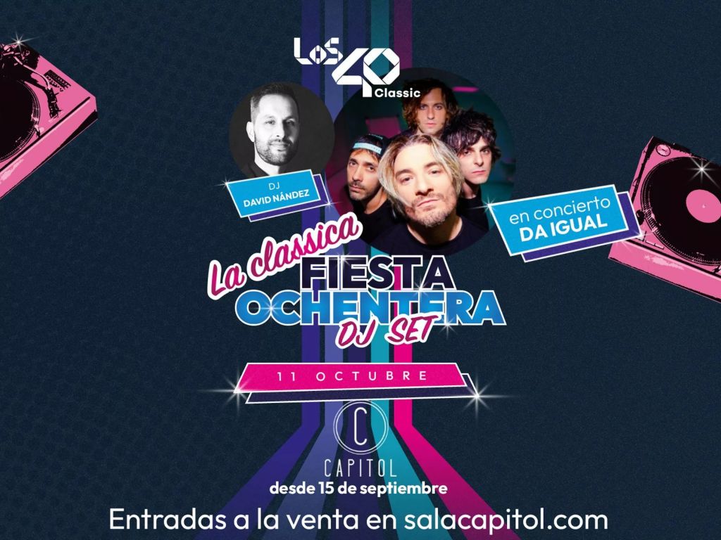 Banda en directo y sesión DJ para una nueva “Clásica Fiesta Ochentera” en Santiago de Compostela. La mejor época del pop vuelve a la Sala Capitol con el grupo "Da Igual" como protagonista de la noche. Las entradas se pondrán a la venta el 15 de septiembre en salacapitol.com. Es el momento de avisar a tus amig@s y de ir preparando de nuevo la reunión de generaciones de los 60 y 70 compostelanos, que, como en cada edición de la Clásica Fiesta Ochentera, vuelven a verse las caras.