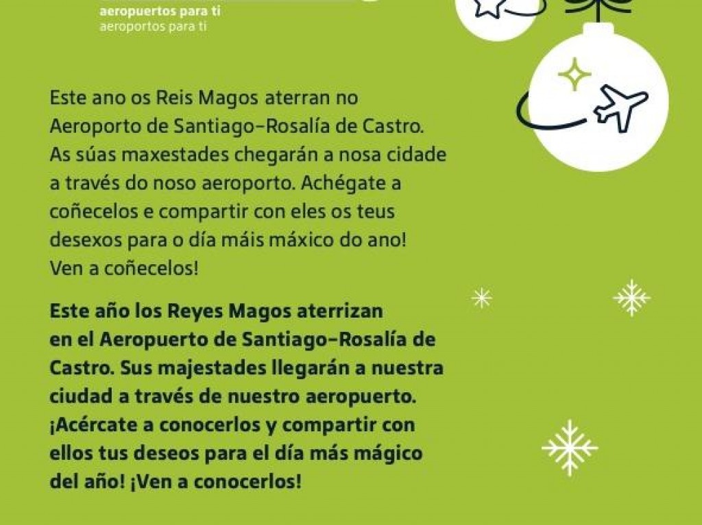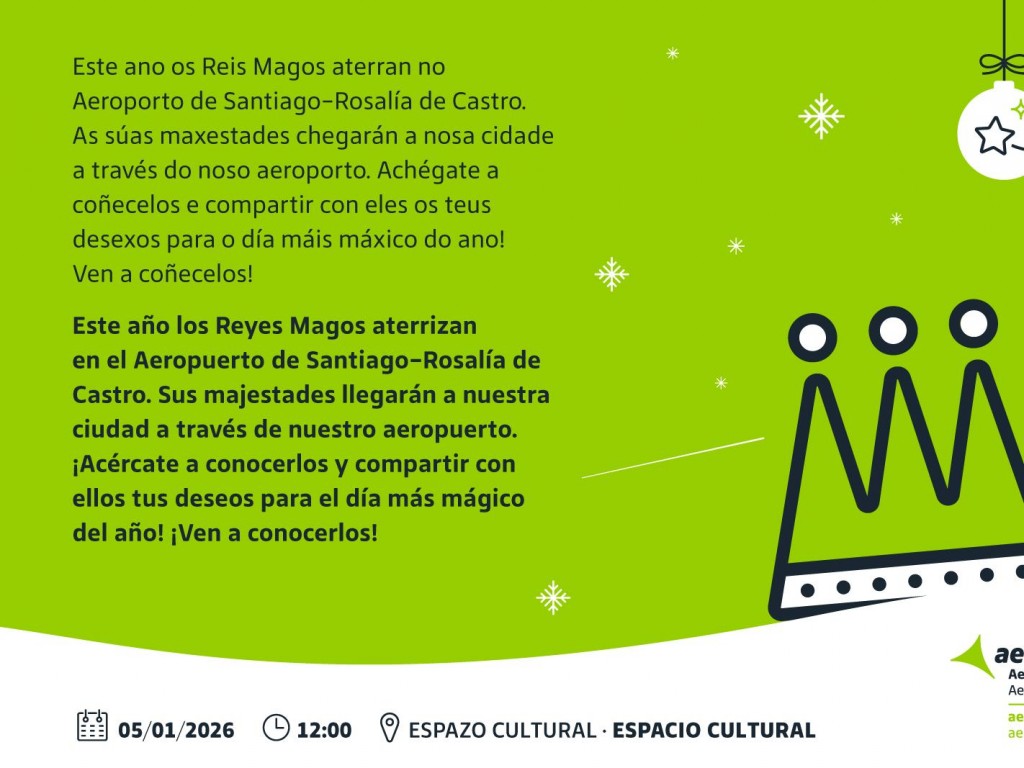 El 5 de enero a las 12:00 h, el Espacio Cultural del Aeropuerto de Santiago-Rosalía de Castro acogerá la llegada de los Reyes Magos, que este año aterrizan en la ciudad a través del aeropuerto. Una oportunidad para conocerlos y compartir con ellos los deseos en el día más mágico del año.