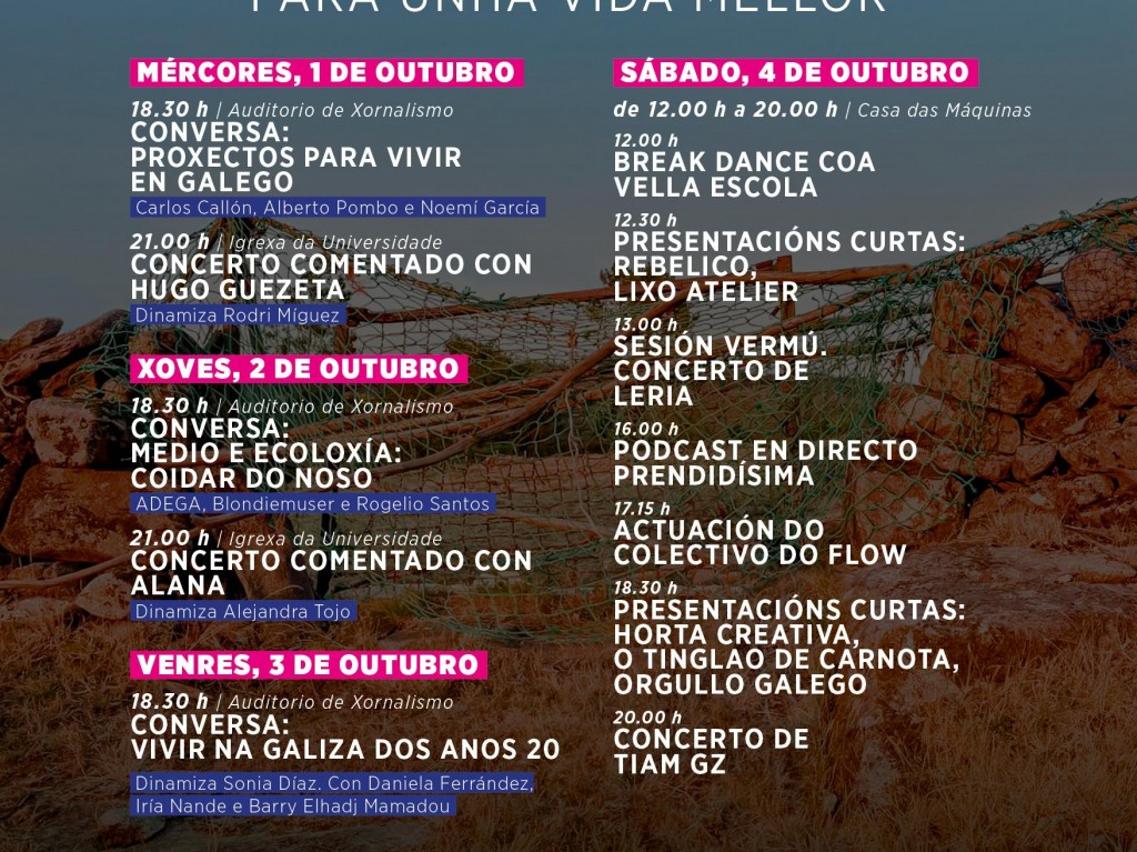 Durante cuatro días, jóvenes y público general podrán participar en conversaciones sobre lengua, ecología, identidades y vivienda en el Auditorio de Periodismo; asistir a conciertos comentados en la Iglesia de la Universidad con Hugo Guezeta y Alana; y disfrutar de actividades en la Casa das Máquinas como break dance, presentaciones pechakucha, podcast en directo y conciertos de bandas gallegas emergentes.