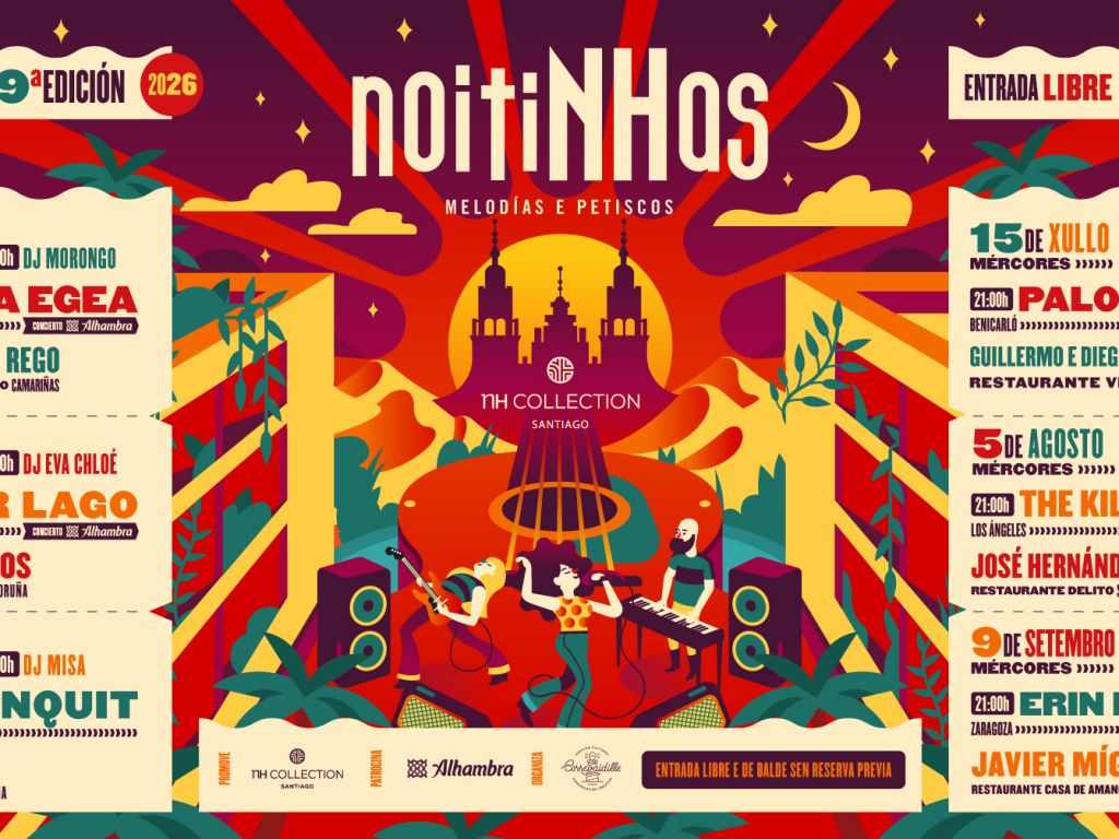 NoitiNHas 2026 regresa con su novena edición para llenar las noches compostelanas de música en directo y propuestas gastronómicas. El ciclo, que se celebra en el NH Collection Santiago, combina conciertos al aire libre con sesiones DJ y tapas de restaurantes invitados, creando una experiencia completa en torno a la música y el sabor.