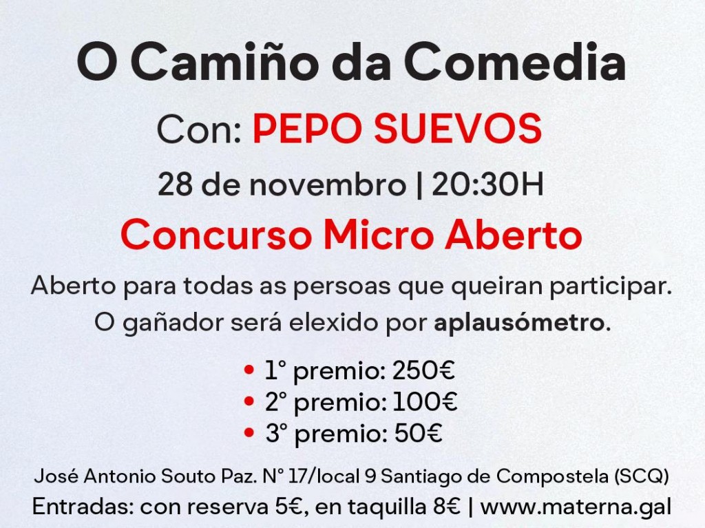 El viernes 28 de noviembre a las 20:30 h, el espectáculo de micro abierto O Camiño da Comedia vuelve en formato concurso, presentado por Pepo Suevos. Abierto a todas las personas que deseen participar, el público elegirá a los ganadores con su aplauso. Habrá tres premios: 250 €, 100 € y 50 €.
