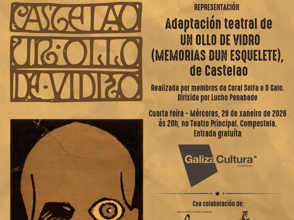 El Teatro Principal acogerá el miércoles 28 de enero, a las 20.00 h, una nueva función de Un ojo de vidrio (Memorias de un esqueleto), adaptación teatral de la obra de Castelao dirigida por Lucho Penabade. La propuesta combina humor y crítica social para reflexionar, desde la mirada de un esqueleto, sobre cuestiones aún vigentes como la emigración, el caciquismo o la defensa del gallego. Entrada gratuita con invitación.