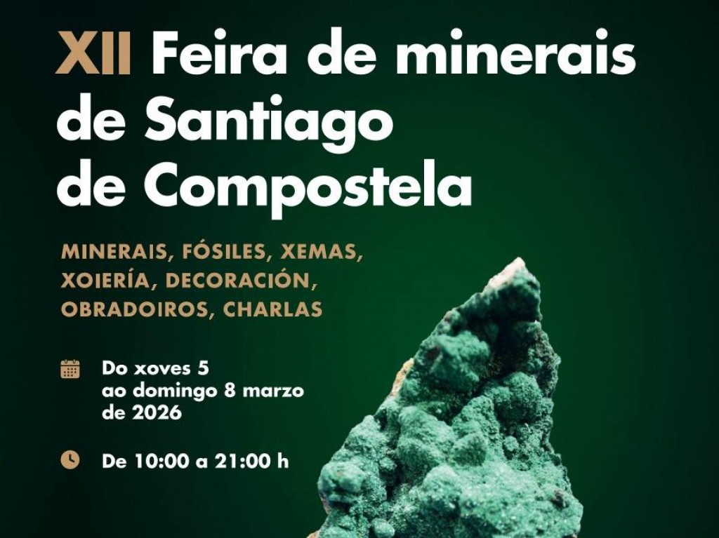 La XII Feria de Minerales de Santiago de Compostela se celebrará los días 5, 6, 7 y 8 de marzo en las instalaciones del centro comercial Área Central. Esta edición amplía su programación con más talleres para centros educativos y un mayor número de expositores, mejorando la calidad expositiva. El público podrá disfrutar de una destacada colección de fósiles procedentes de Marruecos, así como de exposiciones de minerales del Museo de Minerales de O Porriño y del Museo de Historia Natural de Santiago de Compostela. Como novedad, el programa incluye una charla interactiva sobre la extinción de los dinosaurios, impartida por el paleontólogo zaragozano Juan Carlos Escudero.