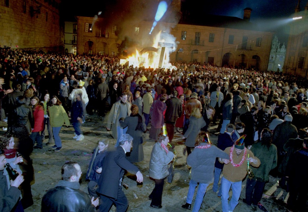 En España la cena de Nochevieja se organiza de forma que la hora del postre coincida con la medianoche, momento en que todos los medios de comunicación transmiten el sonido de las doce campanadas que inauguran el Año Nuevo. Coincidiendo con cada una de las doce campanadas se toman las doce uvas de la suerte. Muchos restaurantes ofrecen esa noche la posibilidad de asistir a cenas-espectáculo. En la mayoría de los pubs, bares y discotecas de la ciudad se organizan fiestas especiales que terminan por la mañana. Pero antes de ir a dormir, todavía hay que tomar una taza de chocolate con churros, desayuno inexcusable del primer día del año.