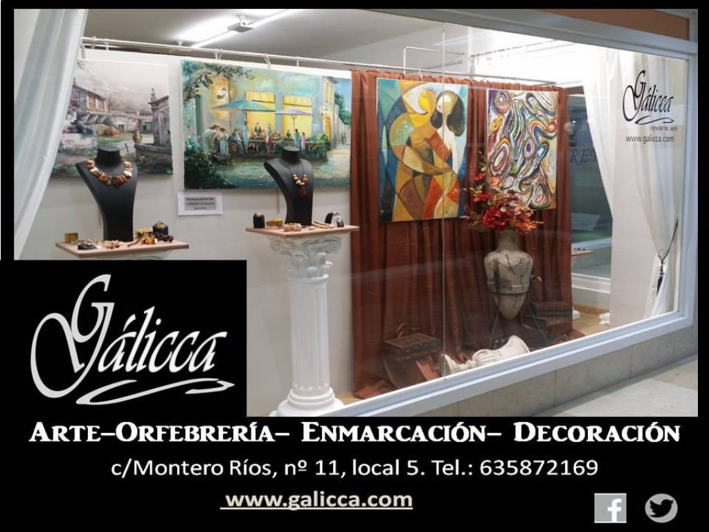 Galicca es una innovadora galería de arte online a través de www.galicca.com y también en su sede física de la calle Montero Ríos Santiago de Compostela, cuyo objeto es la promoción de artistas y la venta de obras de arte originales. Es el fruto de más de 35 años de experiencia en la representación y apoyo de la creación artística en España. La difusión y reconocimiento de la creatividad y el posicionamiento de muchas carreras artísticas son posibles gracias a una intensa tarea de promoción e intermediación tanto a nivel online como directa, pues contamos con una privilegiada y extensa red de galerías, centros culturales, espacios colaboradores y patrocinadores, además de acceder directamente a un gran número de clientes y coleccionistas a nivel nacional e internacional. Actualmente contamos con más de 50 artistas de diferentes disciplinas artísticas y ofrecemos más de 500 obras artísticas y decorativas.