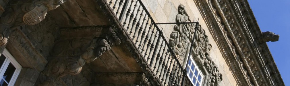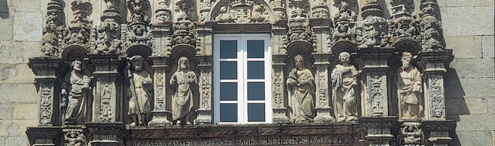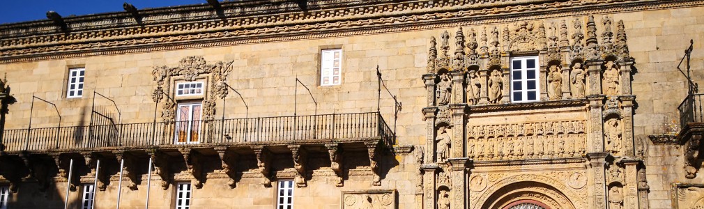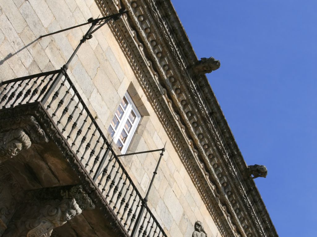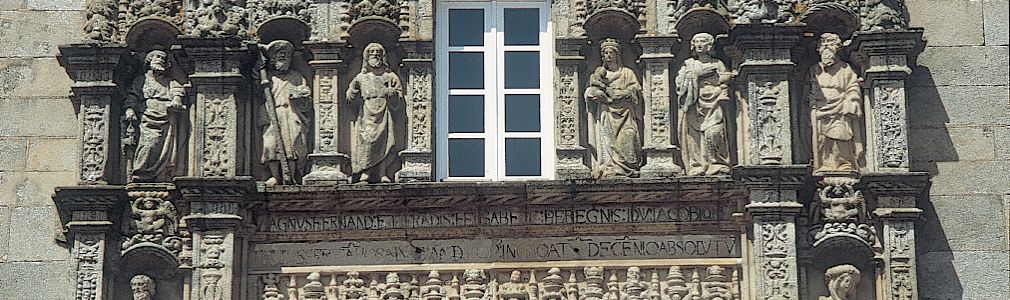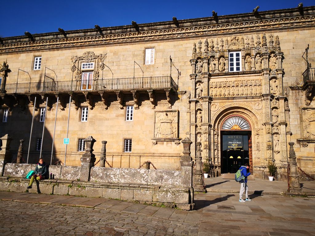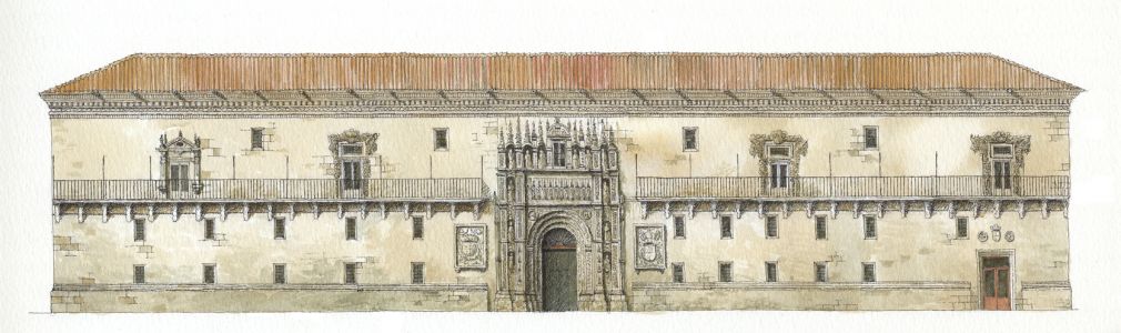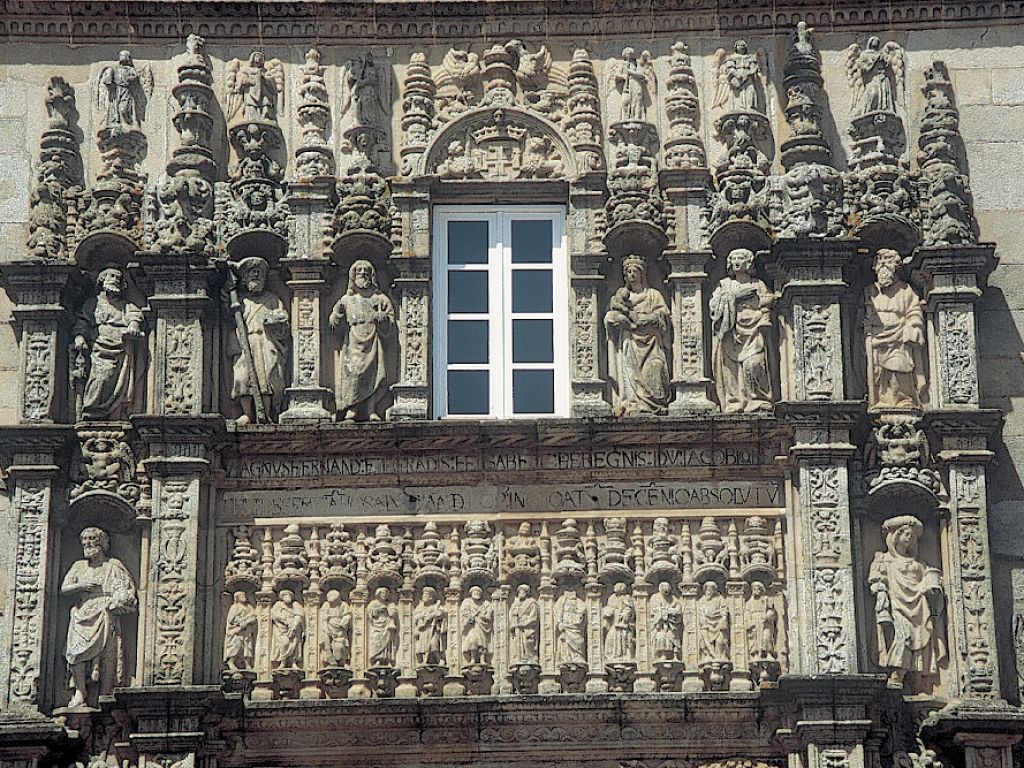 El proyecto de las obras se debe al arquitecto real Enrique Egas. Delante de la fachada podemos ver una fuerte cadena del siglo XVI sostenida por pilares esmeradamente tallados que delimita la propiedad del hospital y que tiene su origen en las disputas de propiedad entre el Ayuntamiento y las autoridades del Hospital. Cuenta con una hermosa portada plateresca obra de los maestros franceses Martín de Blas y Guillén de Colás. En las pilastras de esta portada podemos ver de abajo arriba, las figuras de Adán, Santa Catalina y San Juan Bautista en la izquierda y las de Eva, Santa Lucía y María Magdalena en la derecha. En el friso de la puerta, estructurada a modo de arco triunfal romano aparecen alineadas las figuras de los doce apóstoles. En las pechinas sobre el arco podemos ver los medallones que recogen los bustos de los reyes Isabel y Fernando. Sobre el friso, en el cuerpo superior se abre la ventana del Aposento Real, reservado para hospedar a los monarcas cuando acudieran a Compostela y flanqueada por las imágenes de Cristo, la Virgen, Santiago, San Juan Evangelista, San Pedro y San Pablo. Dos grandes escudos, con las armas de Castilla flanquean así mismo, la portada. Recorriendo todo el frente del edificio vemos los balcones diseñados por fray Tomás Alonso, apoyados en ménsulas muy trabajadas que representan figuras fantasiosas. La cornisa se decora con una minuciosa cadena en la que sobresalen grotescas y obscenas gárgolas.