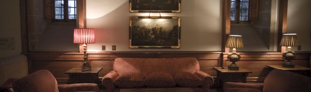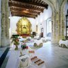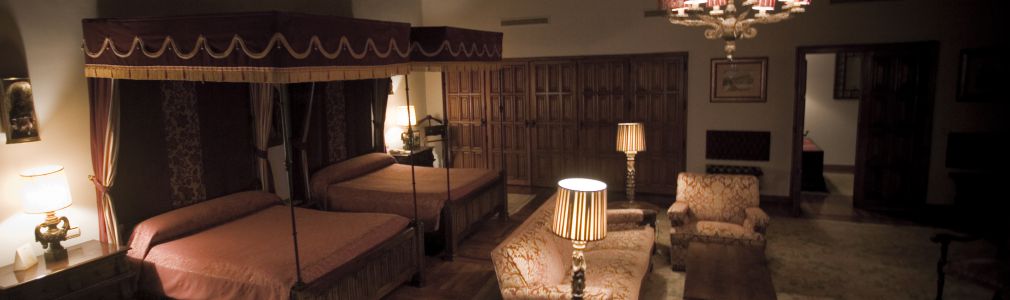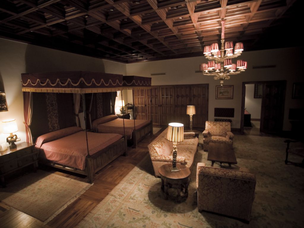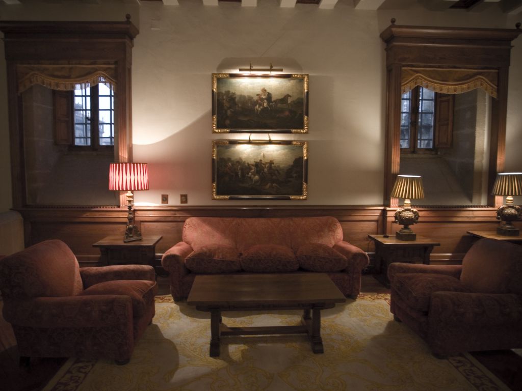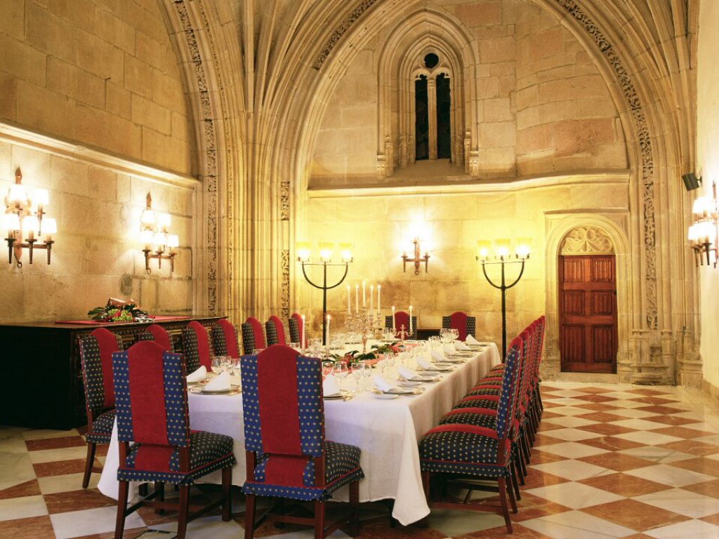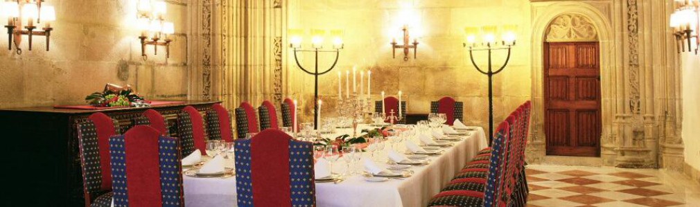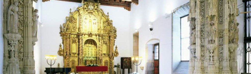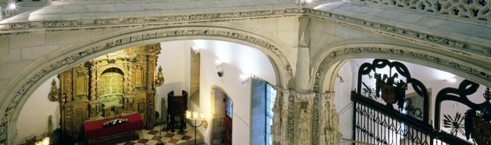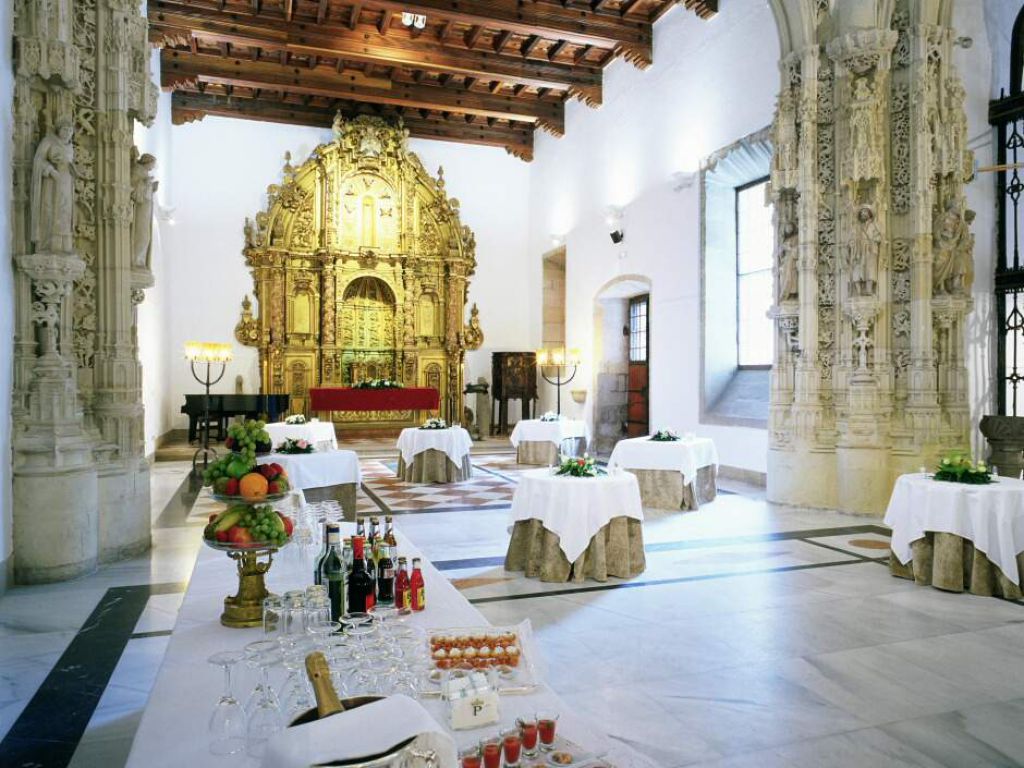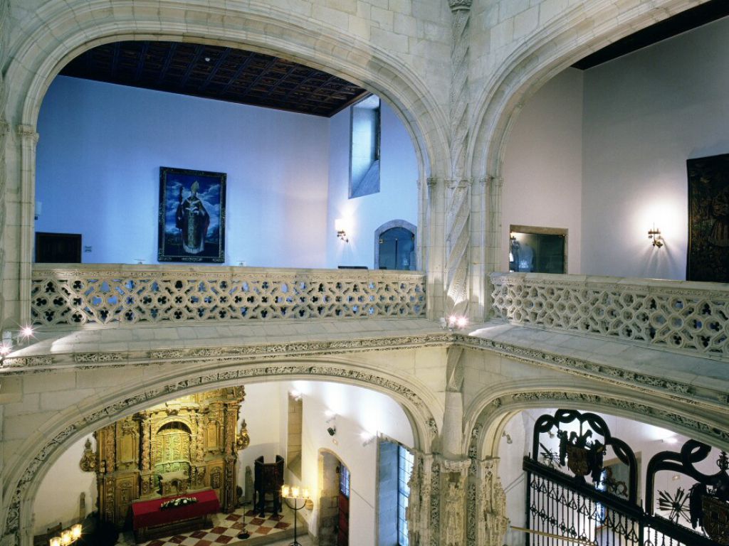 El espacio interior está estructurado en una planta rectangular con cuatro patios. El más artístico de estos patios es el primero que encontramos entrando a la izquierda, en el que destaca sobre todo, la puerta que conduce a la antigua sala de San Luis. El interior del Hostal alberga una hermosa capilla ojival, declarada Monumento Nacional en 1912. La parte más interesante de esta capilla de planta de cruz latina, situada entre los cuatro patios, es el crucero al que se accede a través de un enrejado de hierro de hermosa factura, obra del cerrajero francés Guillén. La bóveda del crucero, confeccionada en piedra litográfica de Coimbra, es de una bellísima filigrana.