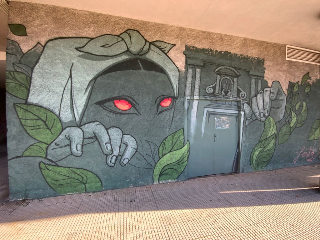 Mural realizado por Festa en la edición 2021 del programa artístico-educativo ELAS TAMÉN PINTAN con técnica mixta. A través de la representación de parte de la arquitectura del Hospital Psiquiátrico de Conxo y de un personaje deliberadamente anónimo, la pieza anima a reflexionar sobre la importancia de la institución sanitaria en la vida del barrio y en las relaciones sociales que se producen en su interior.