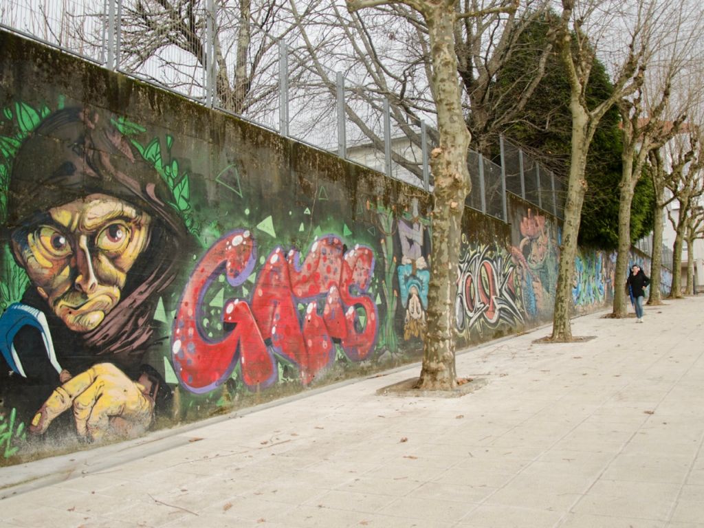 El muro del IES Antonio Fraguas despliega desde hace años intervenciones murales de diversa autoría.