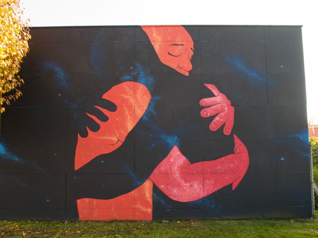 La composición está protagonizada por dos figuras que se entrelazan en un profundo abrazo entre dos mundos, la luz y la oscuridad, una imagen poética que representa y conmemora el día internacional de la lucha contra el VIH. La figura en tonos cálidos representa la esperanza, la vida, la presencia, la salud. La figura oscura simboliza el vacío, la ausencia, la enfermedad. Juntas se retroalimentan conformando otro universo posible en una fusión mutua que las redibuja, las sostiene y las ilumina, simbolizando esta lucha continua de toda la sociedad contra esta grave enfermedad.
