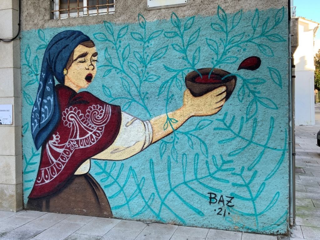 Mural realizado por Tamara Baz en la edición 2021 del programa artístico-educativo ELAS TAMÉN PINTAN con técnica mixta. La composición de la creadora guardesa recrea un episodio histórico de gran importancia para el barrio en el que se sitúa, el Banquete de Conxo, a través de una reinterpretación del brindis, realizado por una mujer que, levantando la taza de vino, reclama igualdad. Como continuación de la escena, en la segunda pared que ocupa el mural, se pueden observar objetos vinculados a las protagonistas de este acontecimiento y, de manera sutil, a la mercería (Sumian) que regenta la propietaria que cedió el muro para la intervención.
