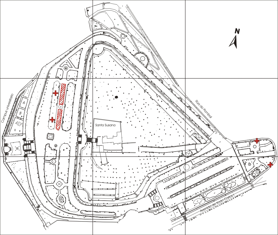 Sobre los perpiaños de granito que bordean la avenida de Juan Carlos I y, con apoyo en algunas palmeras del jardín de La Herradura, hay sendas alineaciones de rosas trepadoras. En el arriate interior de La Herradura existe otra representación de rosas arbustivas, de probable interés por su antigüedad. Entre las columnas del mirador al Campus Sur de la Universidad de Santiago hay tres viejos ejemplares trepadores. En el talud que mira al oeste se han plantado macizos tapizantes.