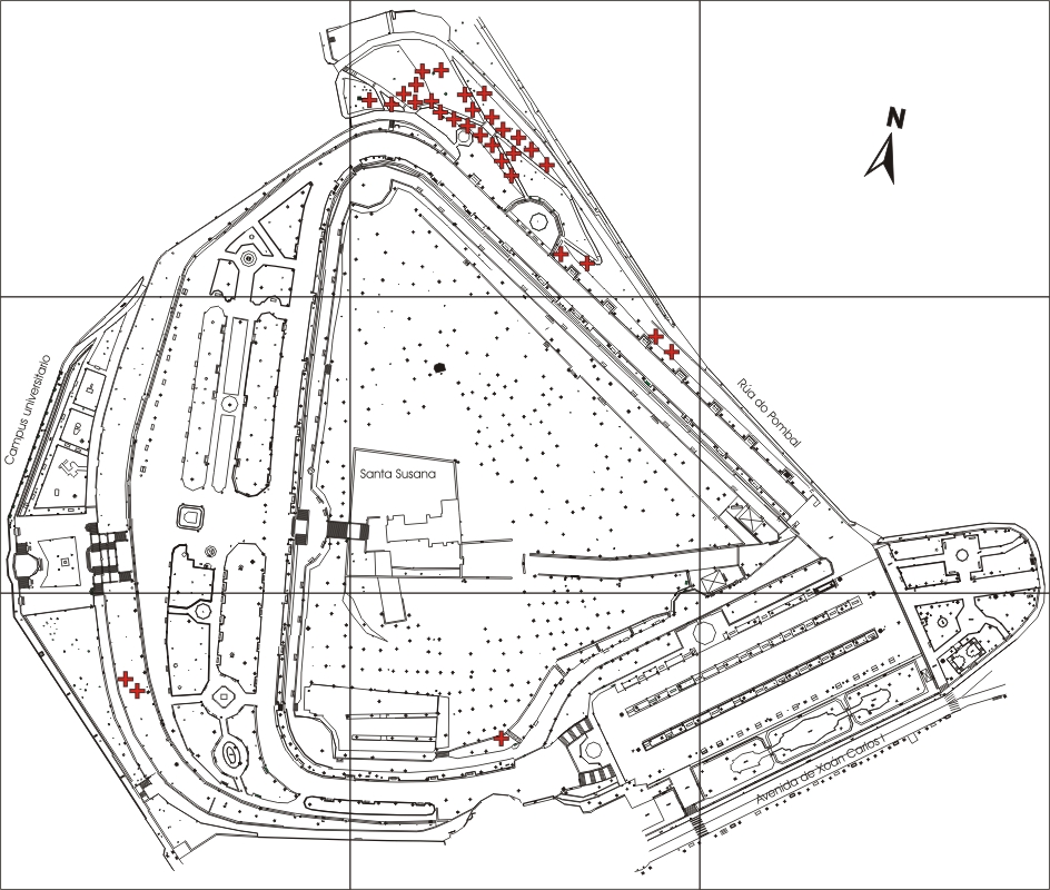 Hay numerosos ejemplares en el talud que da a la calle del Pombal, bajo el Eucalipto de los Enamorados y la plazoleta contigua. Alguno más hay en el talud izquierdo de bajada a la plataforma frente a la Facultad de Químicas.