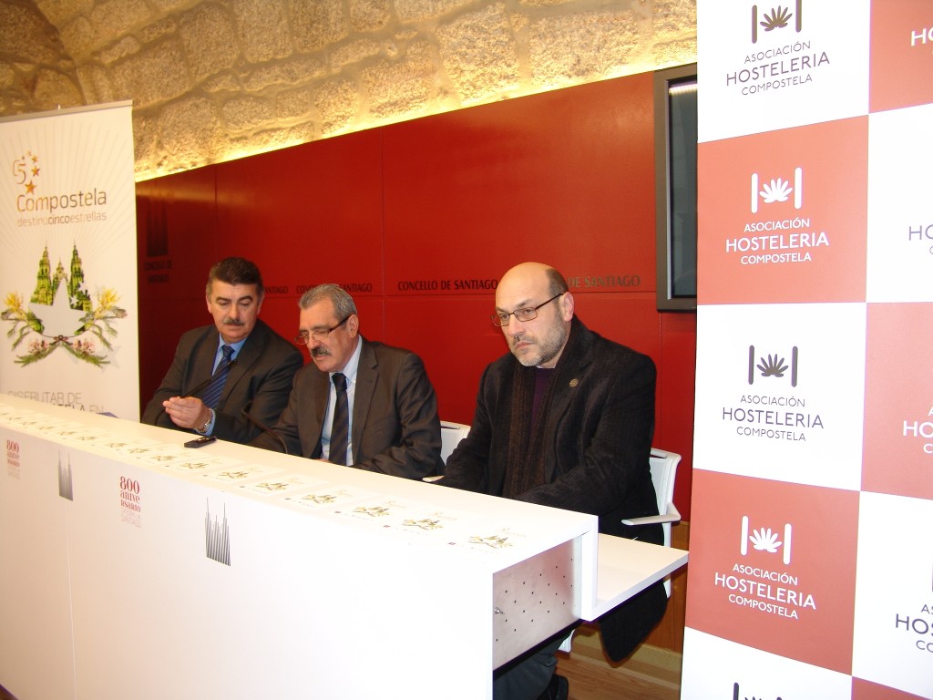 El Pazo de Raxoi acogió la presentación de "Compostela, destino cinco estrellas", una iniciativa de la Asociación Hostelería Compostela para la promoción de los hoteles de la ciudad y de su comarca, que cuenta con la colaboración de Turismo de Santiago y de la Asociación de Guías Turísticos de Galicia. En el acto participaron el vicepresidente de Hosteleria Compostela, Carlos Tardáguila, el gerente de la asociación, Andrés Condide, y el presidente de la Asociación de Guías Turísticos de Galicia, Guillermo Proupín. También estaba prevista la presencia de la concelleira de Turismo, Reyes Leis, pero no asitió sumándose a los tres días de luto oficial decretados por la Xunta de Galicia por el fallecimiento de Manuel Fraga.