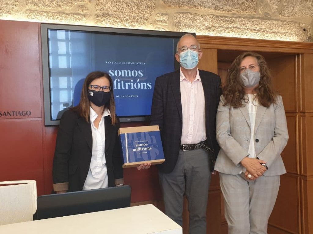 El concejal de Turismo, Sindo Guinarte, la Vicerrectora de Igualdad, Cultura y Servicios de la Universidad de Santiago, María del Mar Lorenzo, y la gerente de Turismo de Santiago, Flavia Ramil, presentaron en el Pazo de Raxoi la nueva campaña del Santiago de Compostela Convention Bureau, servicio de Turismo de Santiago, dirigida a la captación de turismo de congresos bajo el lema “Somos Anfitriones”.