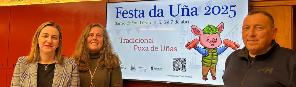 La concejala de Turismo, Míriam Louzao, la gerente de Turismo de Santiago, Flavia Ramil, y el presidente de la asociación gastronómica y cultural Orden da Uña, Fernando Neira, presentaron el programa de la Festa da Uña, una celebración con gran tradición en Compostela, que es además una de las fiestas gastronómicas más antiguas del país, y con la que colabora Turismo de Santiago gracias al apoyo de la Diputación de A Coruña.