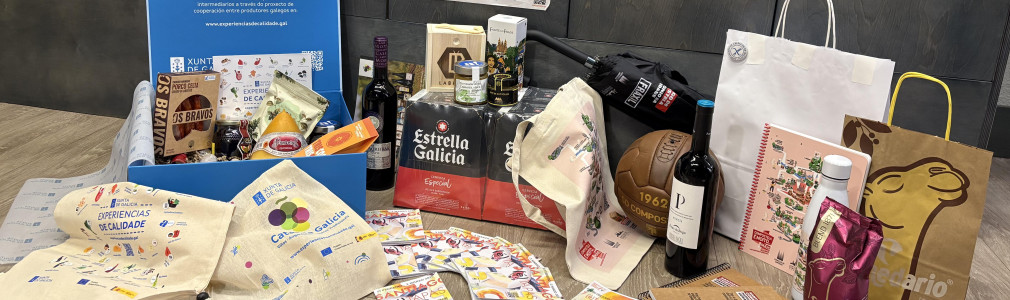 Entre ellos, destacan productos gallegos de calidad diferenciada procedentes de DOP, IXP, Agricultura Ecológica y de Artesanía Alimentaria (AGACAL); botellas de vino Ponte da Boga; packs de cerveza Estrella Galicia Especial; y lotes de Cafés Dromedario y ACEGA (asociación de personas celíacas de Galicia). Así como abonos para el Obradoiro CAB y la SD Compostela, balones vintage del Compos, libretas y bidones ilustrados, paraguas, etc.