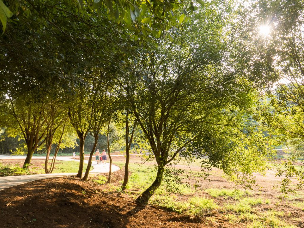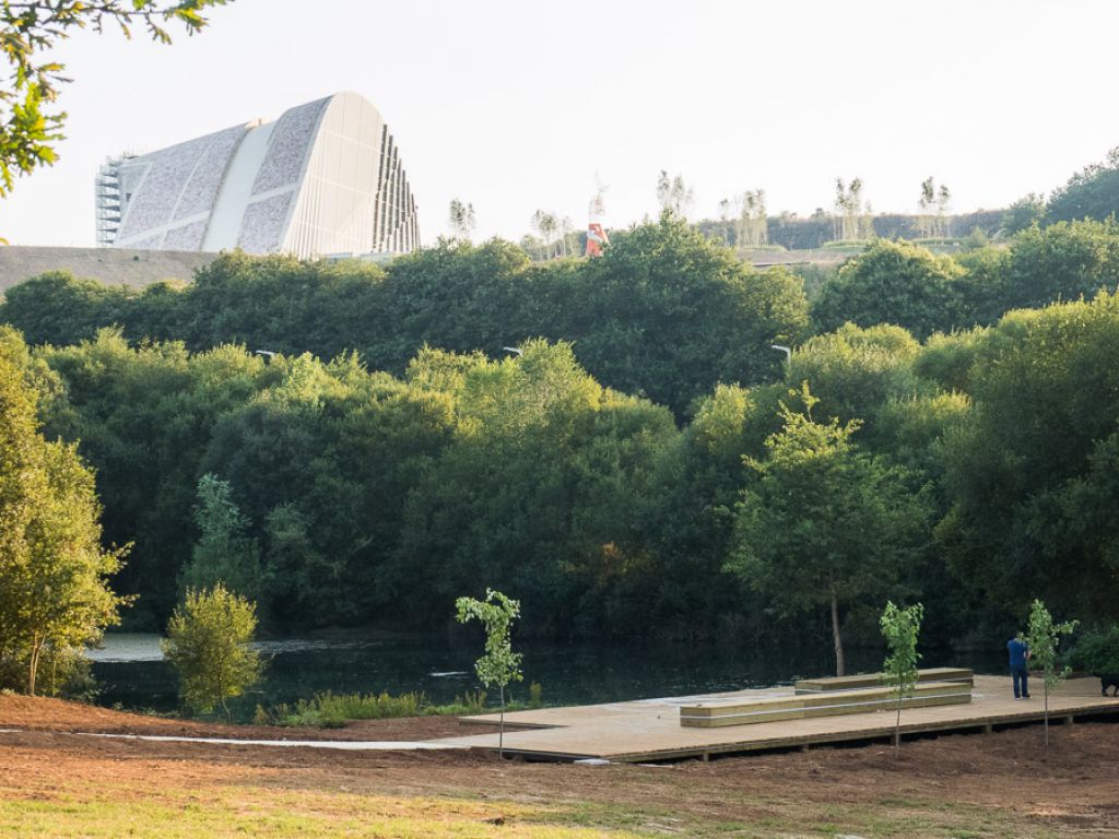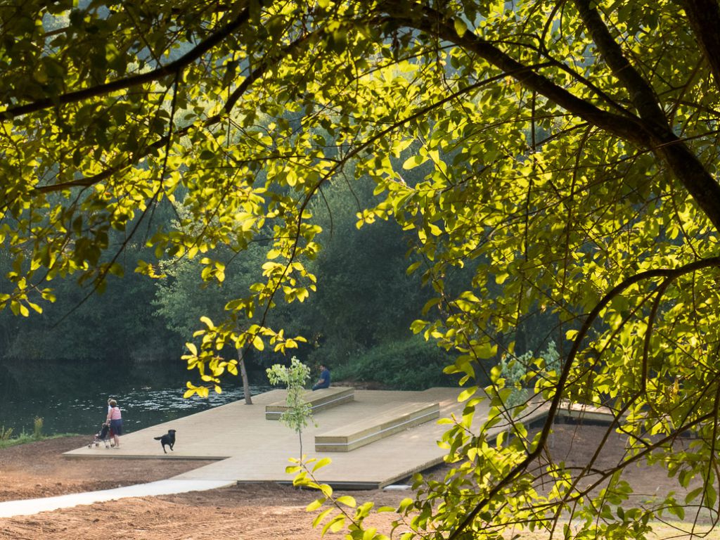 Esta área verde cuenta con un lago de 4.783 metros cuadrados, rodeado de vegetación ya existente, y una plataforma de madera al borde equipada con bancos, y con un sistema de iluminación con cintas led de bajo consumo.