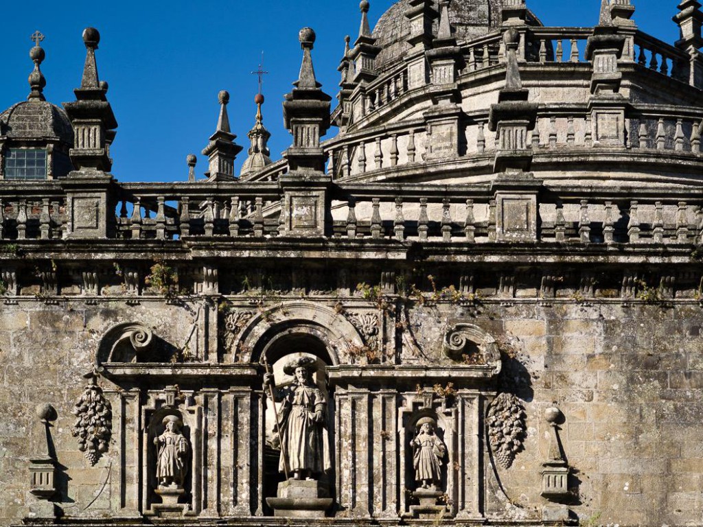 La cabecera románica de la Catedral se oculta en la Plaza de la Quintana detrás de un largo muro barroco coronado de pináculos. Este lienzo es obra de Peña de Toro y Domingo de Andrade, que en el s. XVII otorgaron una elegante imagen de conjunto a todo el lado este de la Catedral, unificando visualmente la Torre del Reloj, la Puerta Real, la Puerta Santa y la Puerta de los Abades.