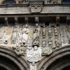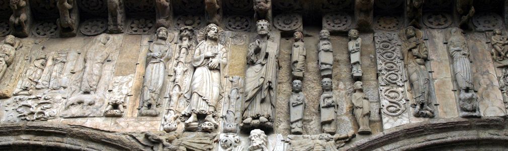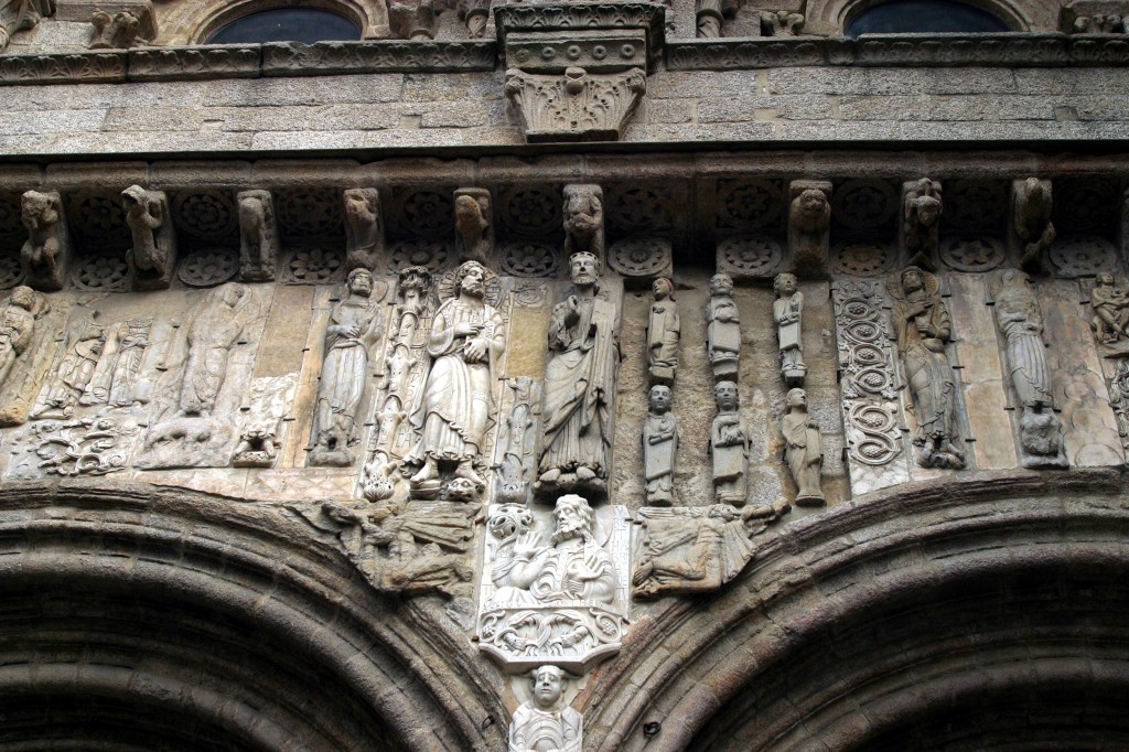La iconografía fue reconstruida pocos años más tarde, y en los siglos siguientes se le añadieron figuras románicas procedentes de la puerta norte de la Catedral, para crear un conjunto que hoy sorprende por su abundancia... y por su desorden. En el friso, por ejemplo, conviven apóstoles, ángeles, signos zodiacales y representaciones del Pecado como la sirena o el centauro. El centro lo ocupa un estilizado Cristo, a cuyo lado está Santiago. En medio de los arcos se reconoce a Abraham saliendo de la tumba y a Moisés representado, como lo haría siglos más tarde Miguel Ángel, con cuernos. Los muros laterales también aprovecharon esculturas de la derruida Puerta del Paraíso, como la creación de Adán y Eva o el rey David en su trono.