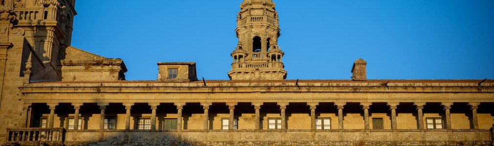 Del exterior del claustro son tan notables su frente al Obradoiro, conocido como Galería de la Balconada –obra de Jácome Fernández en 1615- , como su lienzo oriental, que da a la Plaza das Platerías. Por ambos lados pueden verse sus torres escalonadas, la Torre de la Vela y la Torre del Tesoro, para cuyo trazado Fernández se habría inspirado bien en el Mausoleo de Halicarnaso en Mesopotamia o en las pirámides precolombinas.