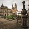 La fachada del Obradoiro contrasta fuertemente con la horizontalidad del claustro, a su derecha, y del Palacio Arzobispal de Gelmírez, a su izquierda. El claustro fue construido por mandato del arzobispo Alonso de Fonseca entre 1521 y 1614. Su gran planta renacentista, obra de Juan de Álava, Gil de Hontañón, Juan de Herrera y Gaspar de Arce, sustituyó al claustro gótico del s. XIII, que a su vez se levantaba en el lugar del original, construido en 1114.
