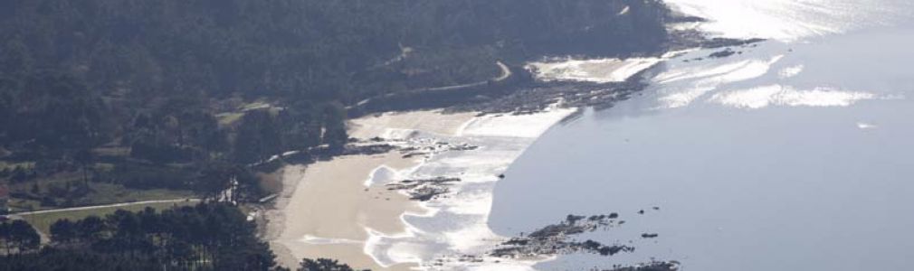 Playa de aguas tranquilas y de poca profundidad con paseo marítimo, parque infantil y una pasarela sobre el río.