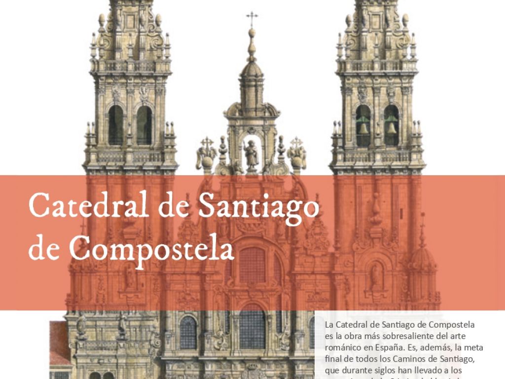 Folleto de gran calidad visual con información sobre la Catedral de Santiago: Botafumeiro, propuesta de recorrido por el interior, principales ritos, etc. Incluye estupendas ilustraciones de los alzados de las fachadas e interior de la Catedral así como un plano detallado del Pórtico de la Gloria, con explicación de su iconografía.