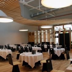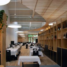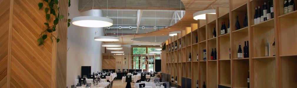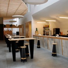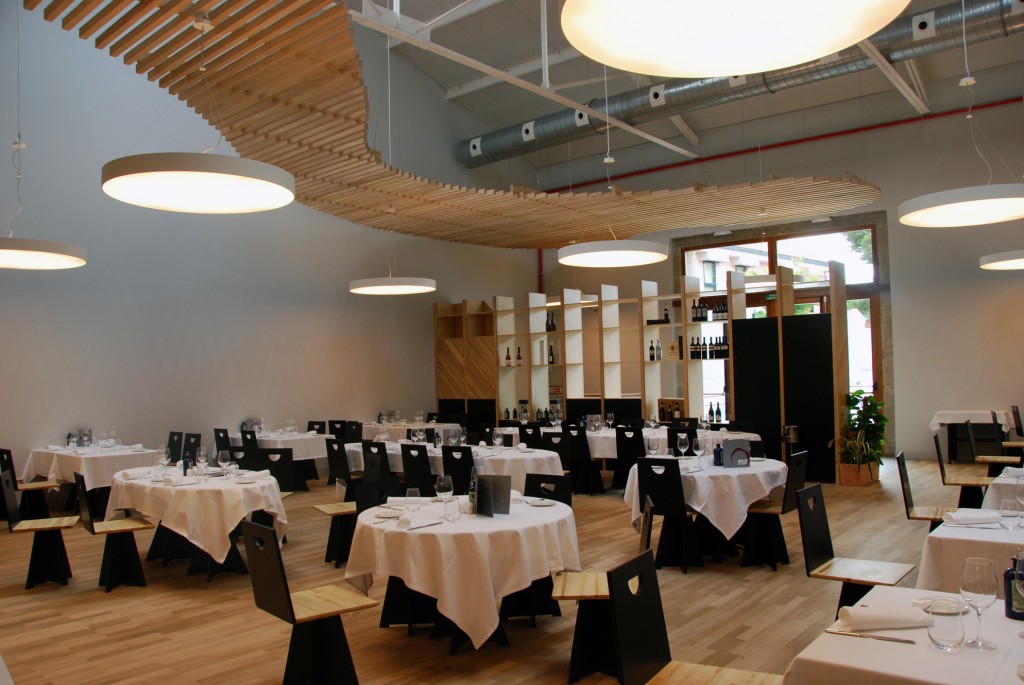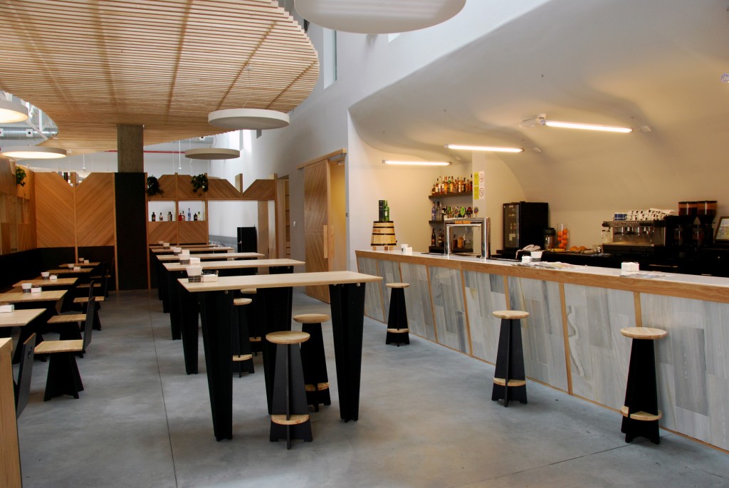 Platos y aperitivos de cocina gallega en café-bar y restaurante minimalista con espacio cultural para eventos.
