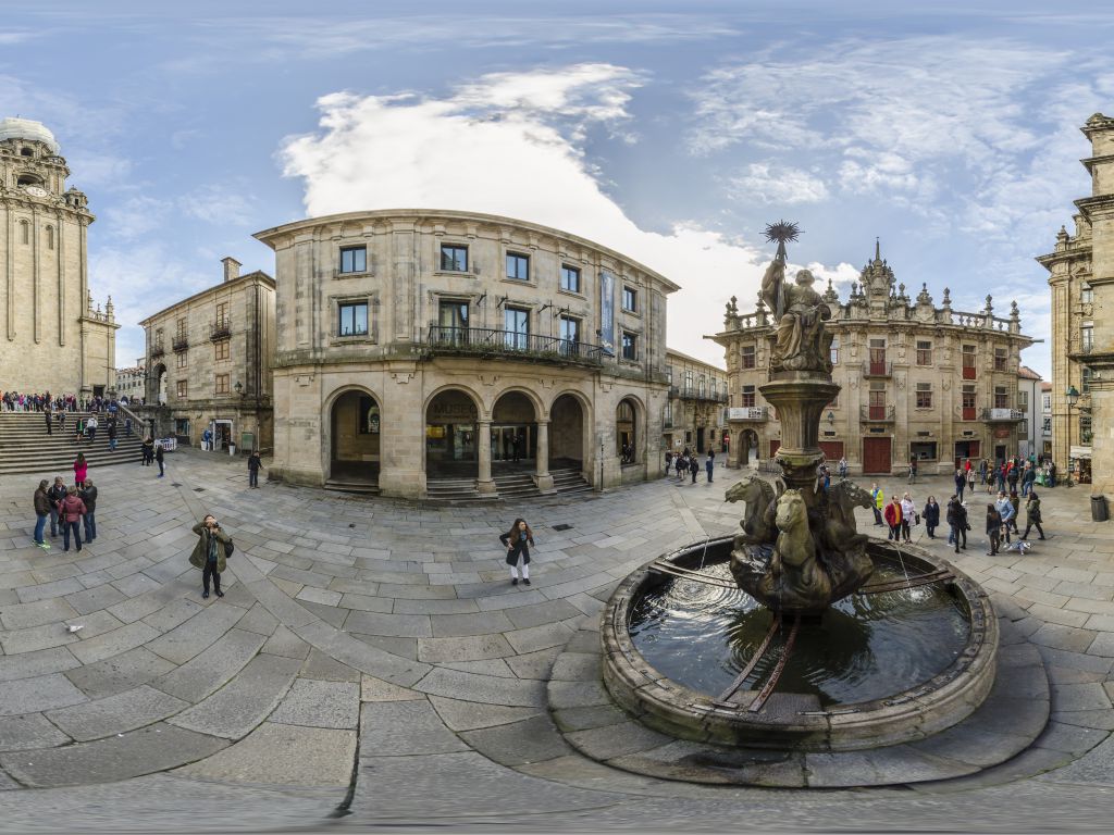 En el centro de la plaza, la Fuente de los Caballos se alza contra el fondo de la Casa del Cabildo, decorada con motivos geométricos típicos del barroco compostelano. Se trata de un verdadero telón de piedra de apenas tres metros de fondo, levantado por el arquitecto Fernández Sarela en 1758, con la intención de cerrar de manera casi teatral la plaza.