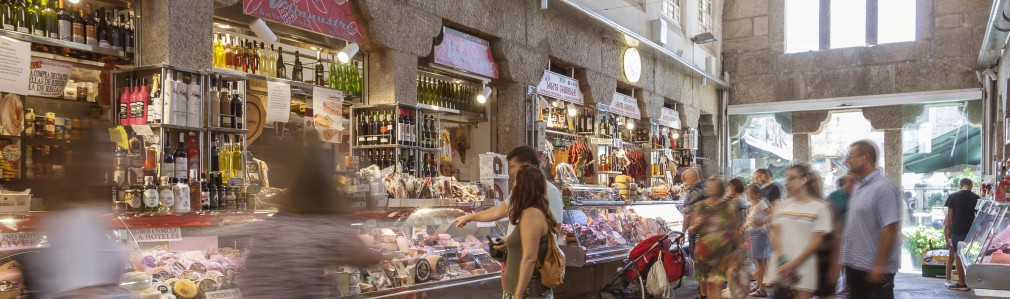 Pero hay más. Los grandes protagonistas del mercado son crustáceos, moluscos y peces de las rías gallegas, conocidos en todo el país por su calidad y sabor. Hay también muchos establecimientos dedicados a la venta de carne de la región, tanto de vacuno como de cerdo. De éste, como dice el dicho, ‘se aprovecha todo’: la matanza ocurre alrededor del día de San Martín, y tras el despiece se destina tanto a carne fresca como a embutidos: ‘androllas’, ‘botelos’, chorizos… Las carnes saladas y curadas entran en la elaboración de caldo gallego, cocidos, lacón (pata delantera curada) con grelos y otros platos. No faltan la ‘cachola’ (cabeza entera, muy apreciada alrededor del Carnaval), la ‘orella’ y hasta las ‘unllas’ (manos), que por sí solas protagonizan una fiesta gastronómica en el barrio compostelano de San Lázaro. La carne de cerdo fresca tiene en Compostela dos estrellas indudables: el jamón asado y el ‘raxo’, lomo en trocitos al ajillo.