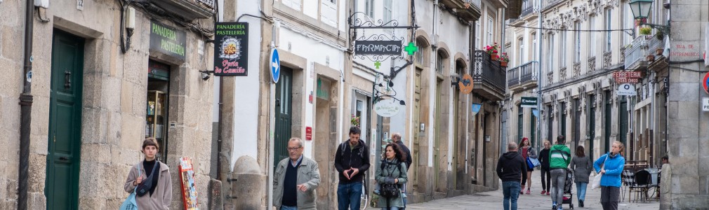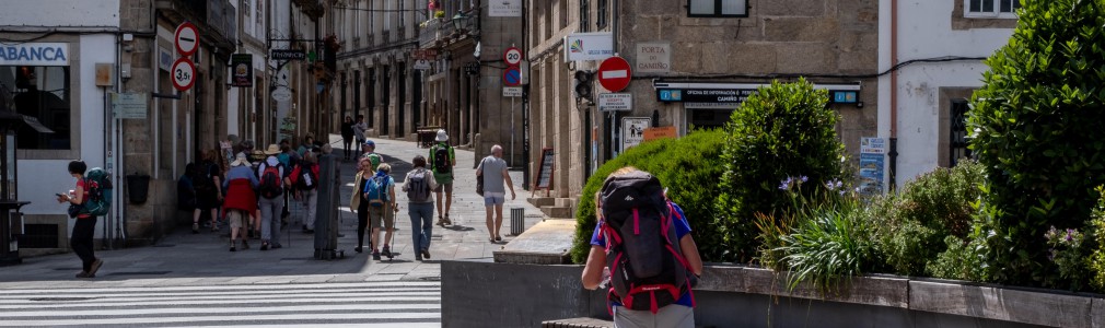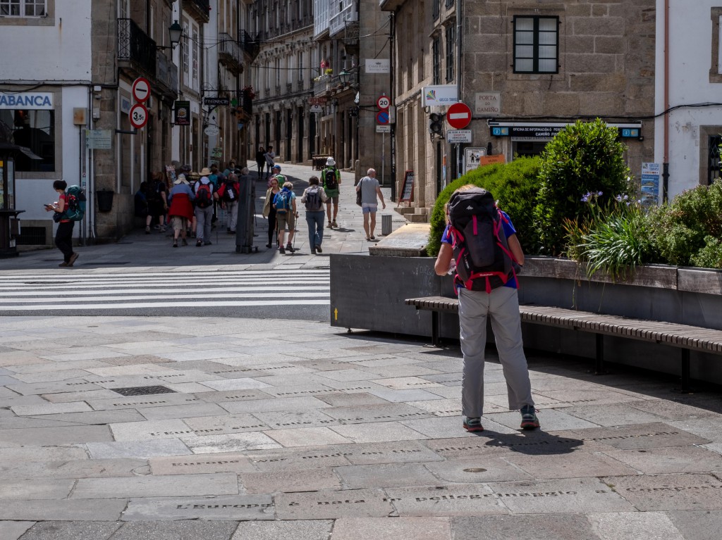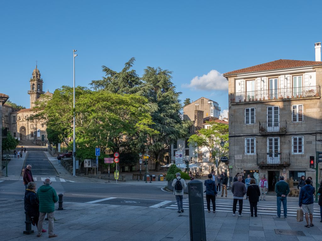 Entrando por la popular rúa de San Pedro y muy cerca del convento de Bonaval, atravesamos el espacio que ocupaba una de las siete puertas de la antigua muralla y nos adentramos en el antiguo recinto fortificado de la ciudad. El lugar se llama aún “Porta do Camiño”, pues fue y sigue siendo paso obligado para los peregrinos que vienen por la variante francesa del Camino de Santiago.