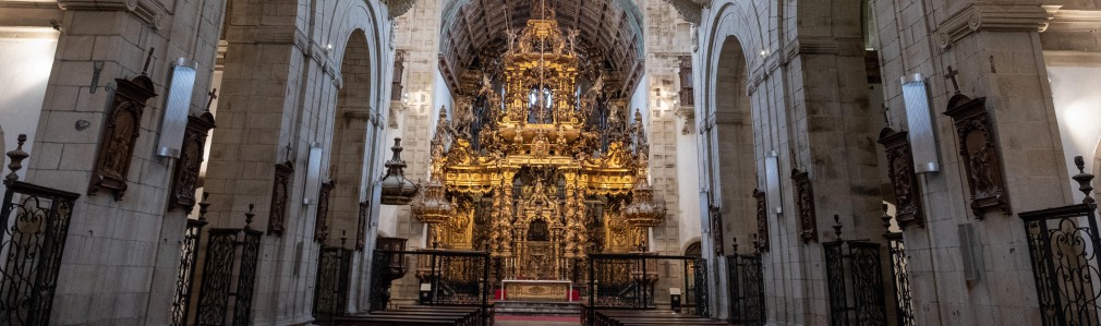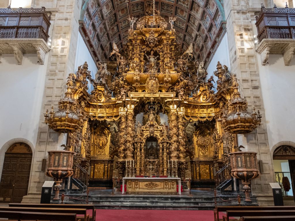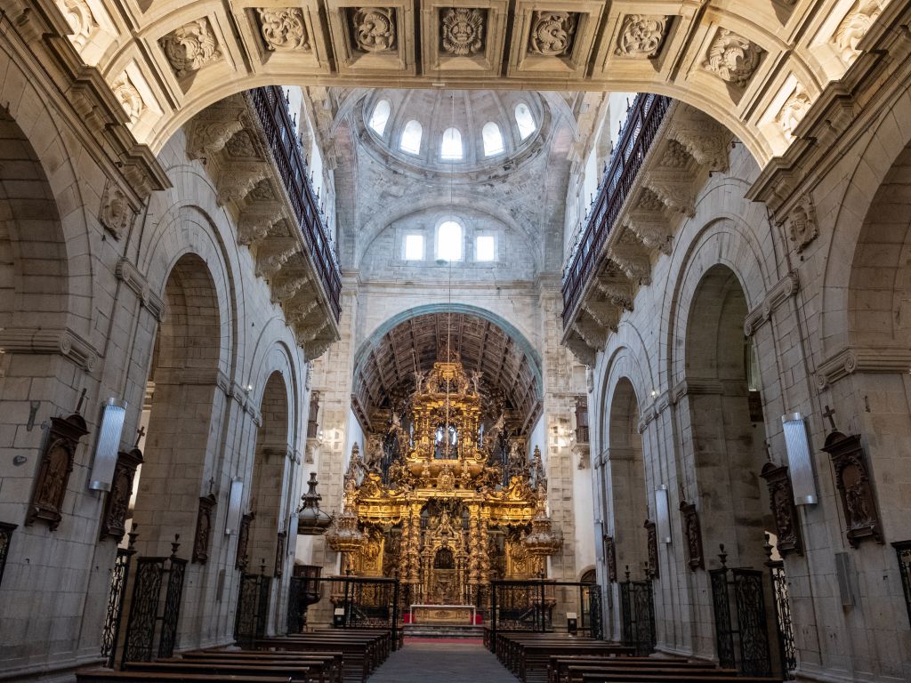 El interior posee planta de cruz latina con tres naves en el brazo principal y una en el transversal, recorridas por una balconada. Llama poderosamente la atención el fastuoso retablo mayor diseñado por Fernando de Casas y Novoa, y ejecutado por Romay, que se considera el mejor retablo barroco de Galicia y probablemente de España. Es preciso destacar la sillería del coro, situada detrás del altar mayor, que fue realizada en nogal por Mateo de Prado, y que es reconocida como la más importante de las existentes en Galicia.