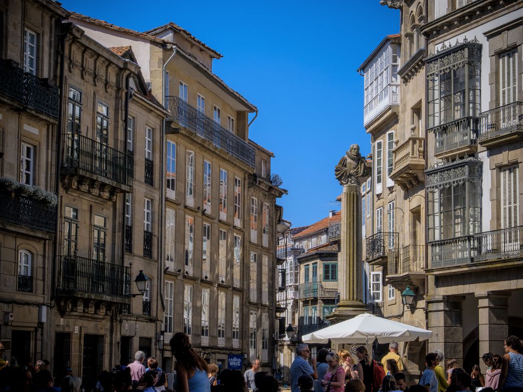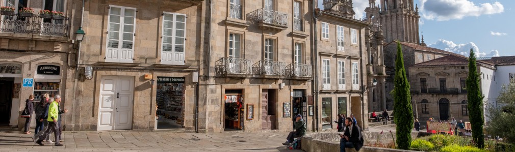 En el siglo XII era conocida como el ‘Foro’, por ser el sitio donde el pregonero leía los acuerdos municipales y las ordenanzas del Arzobispo. Por esta vocación informativa, la calle de la derecha se denomina del Preguntoiro. La esquina la ocupa el edificio del antiguo Ayuntamiento, que estuvo aquí hasta su traslado en 1787 al Palacio de Rajoy.