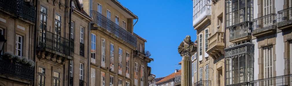 Al trasladarse el mercado a la Plaza de Abastos a finales del siglo XIX, pasó a conocerse como Plaza de Cervantes. En honor al escritor, su busto corona la fuente y nos recuerda que, pese a haber nacido en Alcalá de Henares, el autor de ‘Don Quijote’ era portador de dos apellidos de origen gallego: Cervantes y Saavedra.